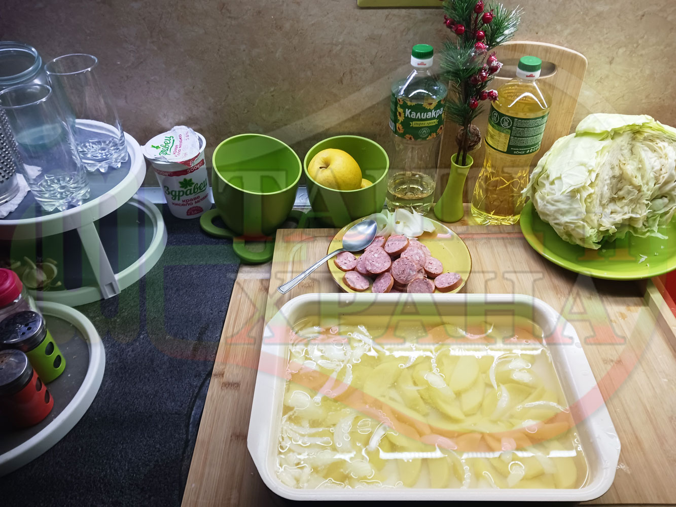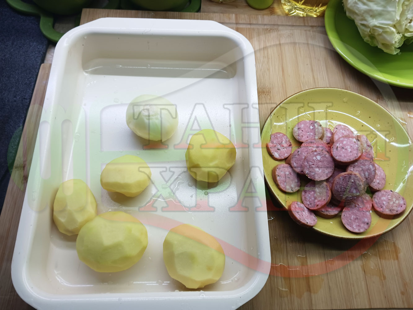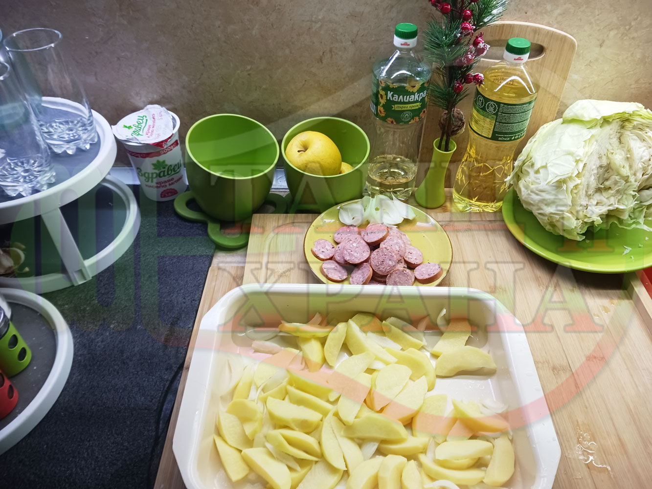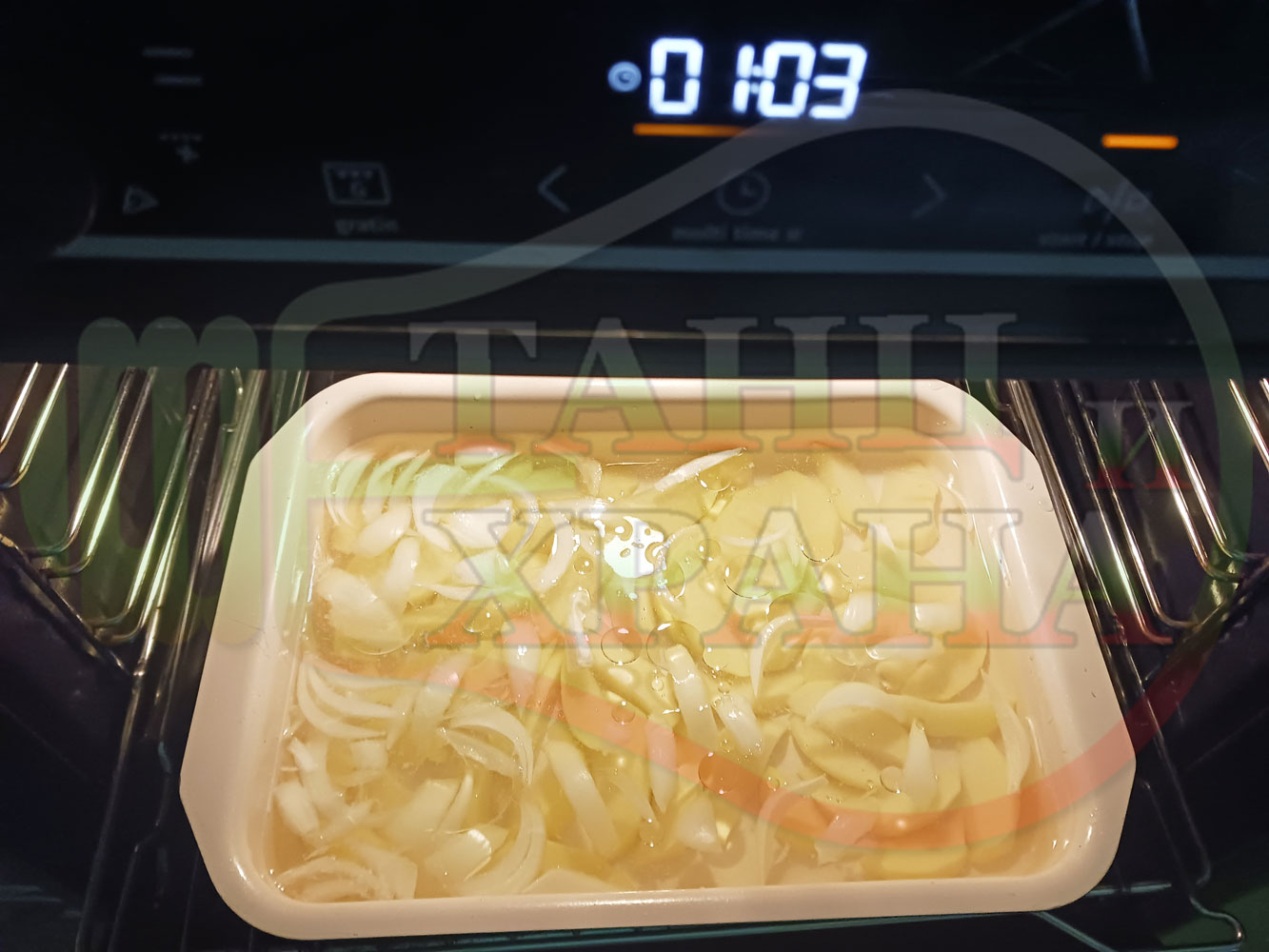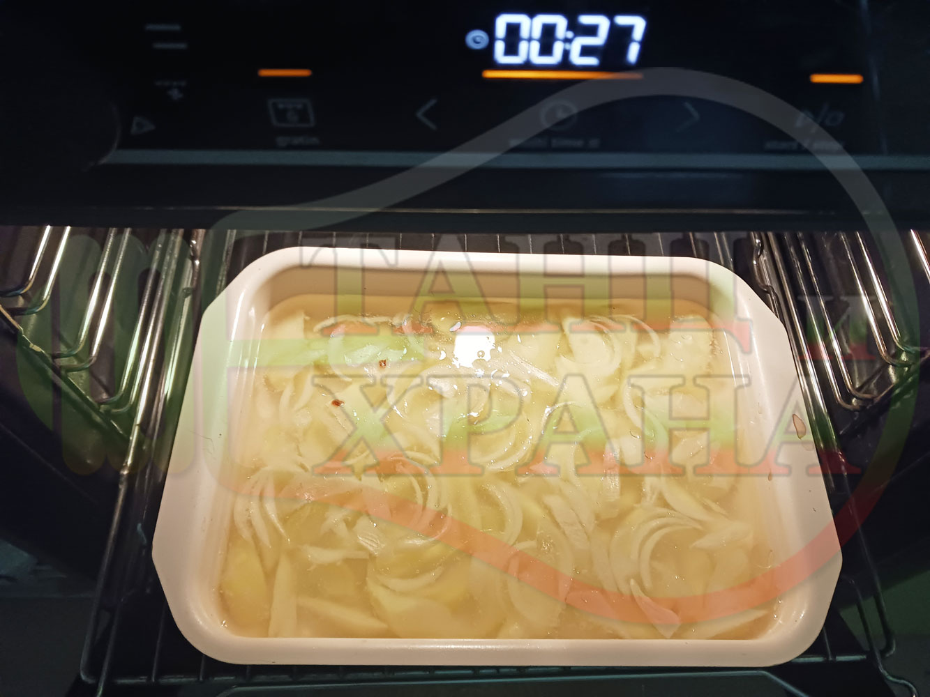 ВНИМАНИЕ: Фурните са различни и съответно времето за сваряване и запичане е ориентировъчно. Наблюдавайте процеса на запичане и при необходимост, покрийте тавата с капак или я отстранете от фурната. Разбърквайте и обръщайте често нарязаната на кръгчета наденица за да се изпече равномерно (след като я добавите).
