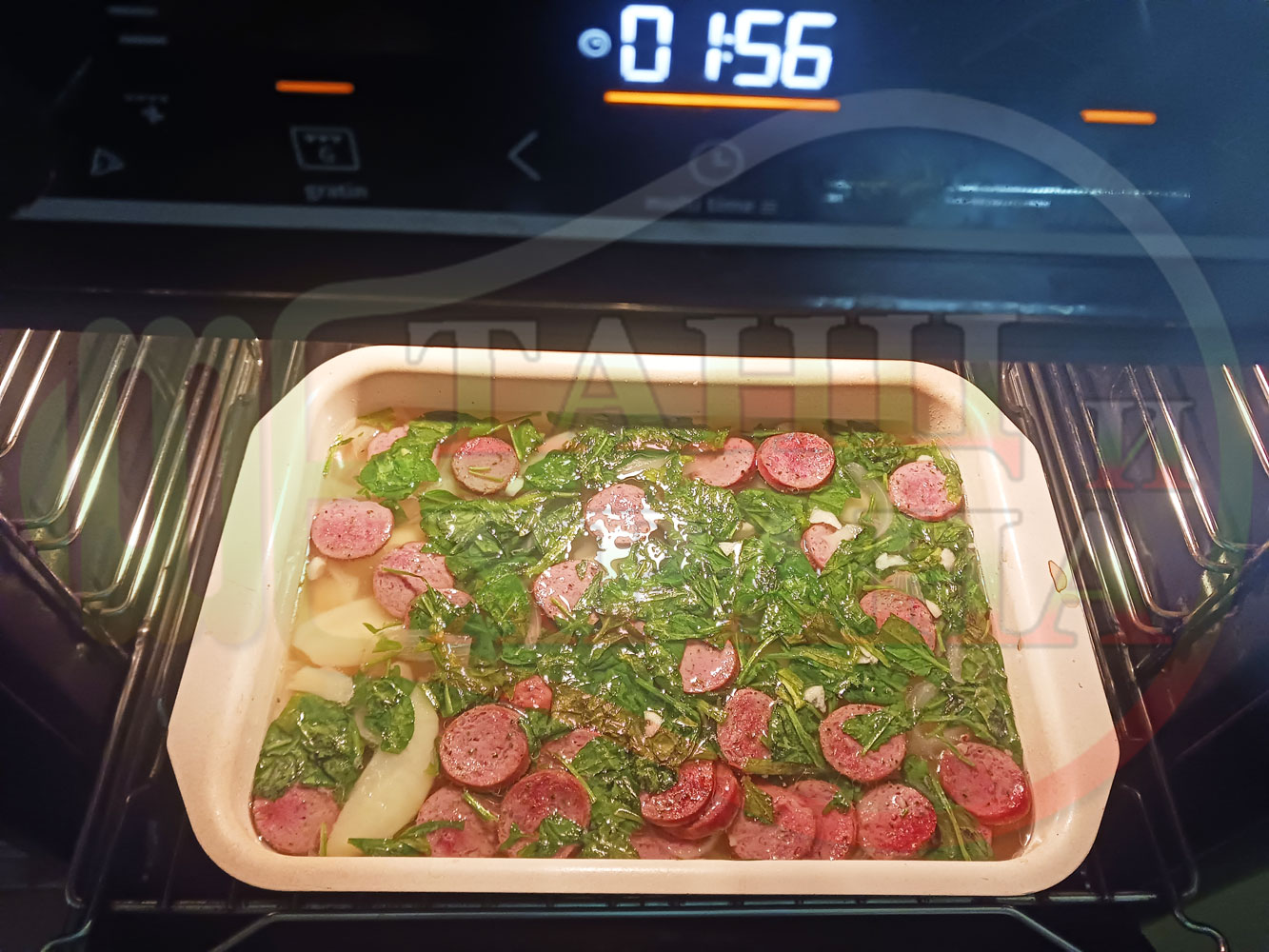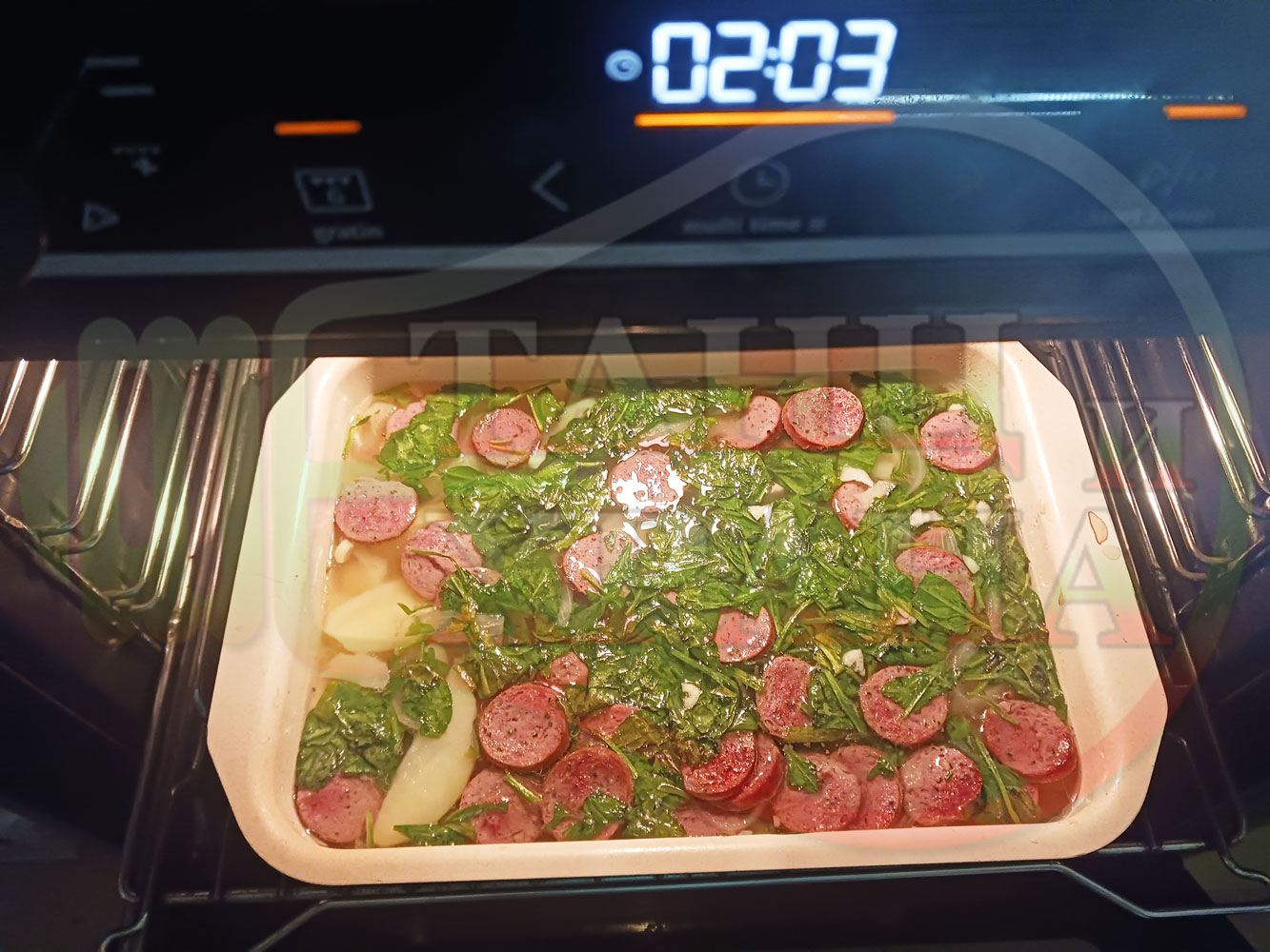 Измийте родопската наденица, обелете я от ципата, нарежете я на кръгчета и я добавете след 30-та минута от началото на зададеното време (добавете я при полусварените картофи и лук към средата на зададеното време). Измийте спанака, нарежете го на едро и го добавете в тавата около 10 минути преди края на зададеното време. Разбъркайте и досварете и дозапечете спаначената яхния до желаната от вас степен (средно запечени картофи и наденица или по-запечени с по-сварен и разварен спанак).