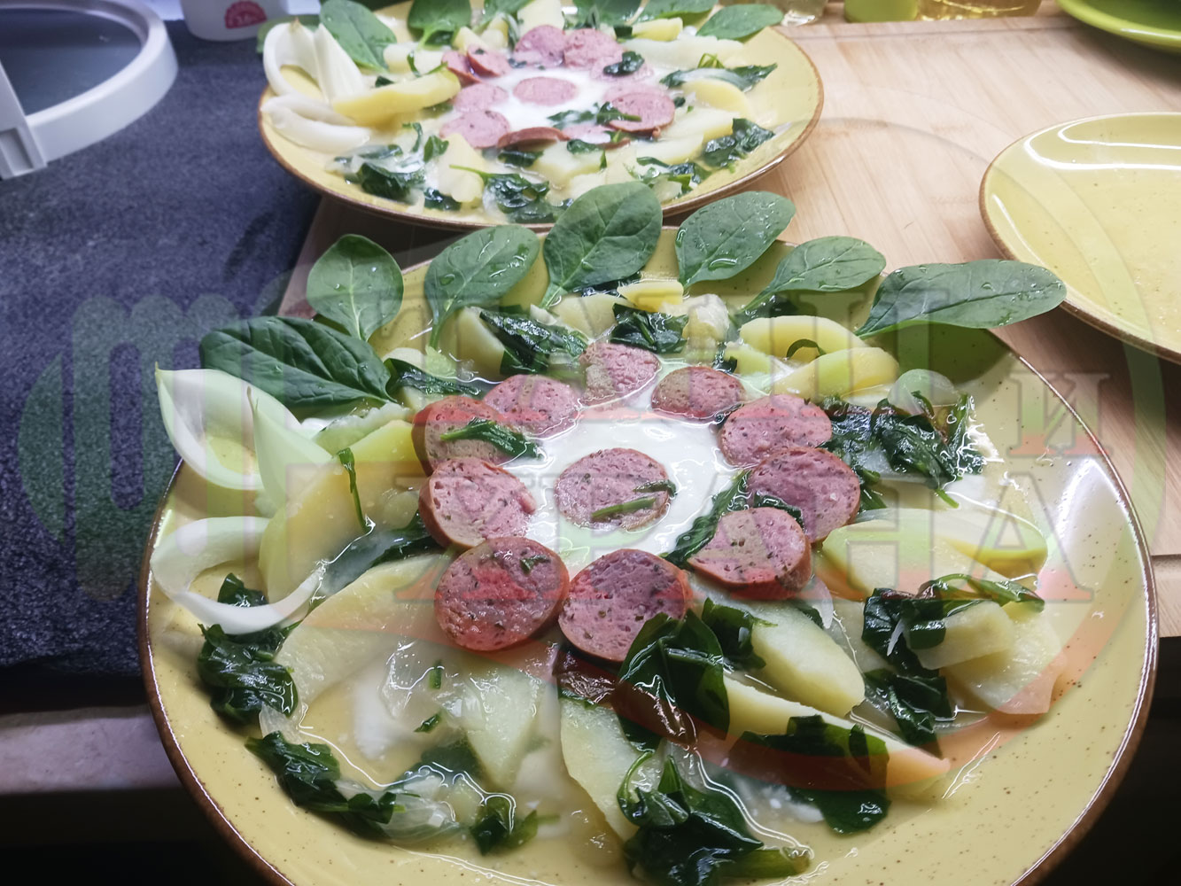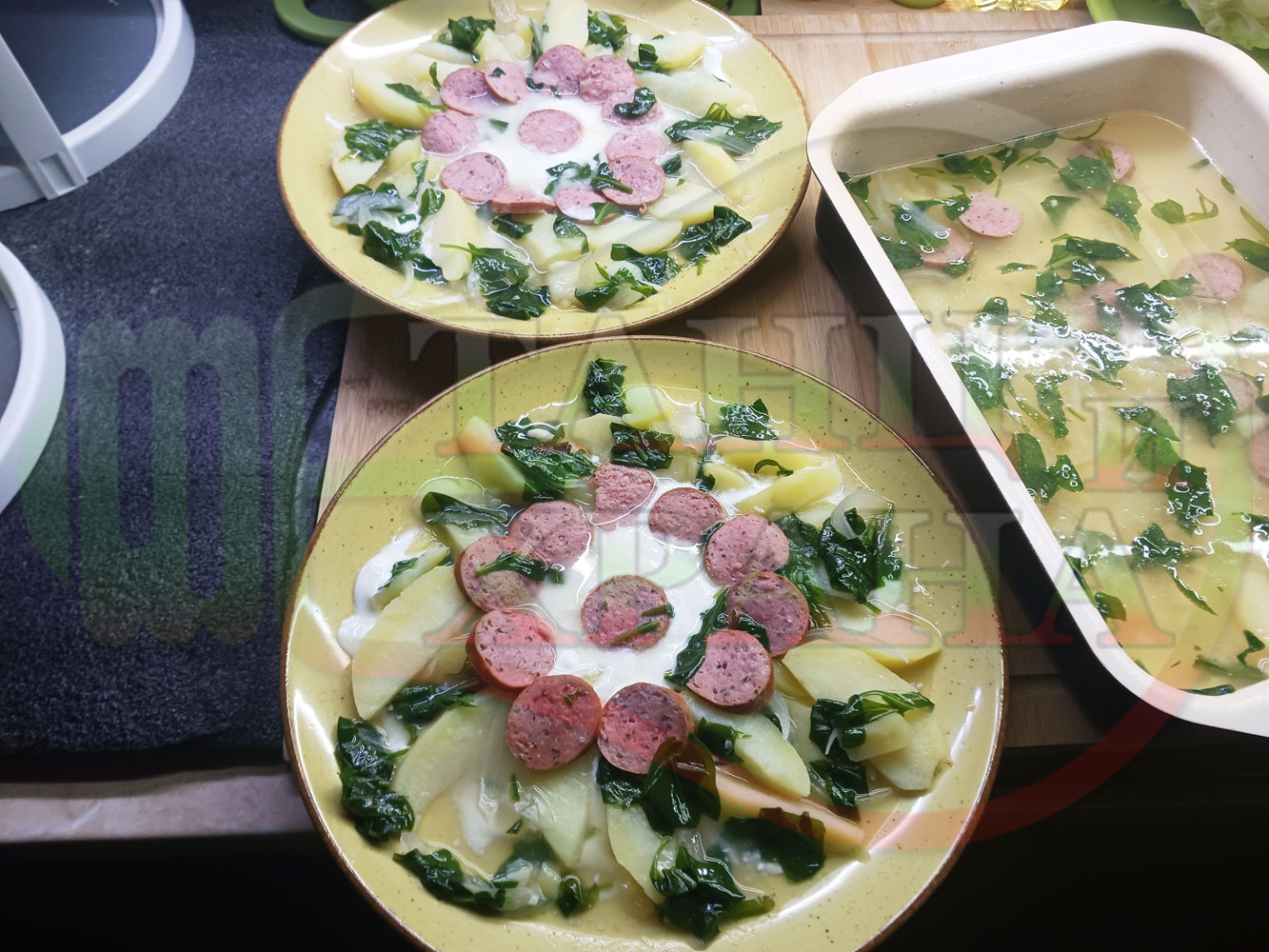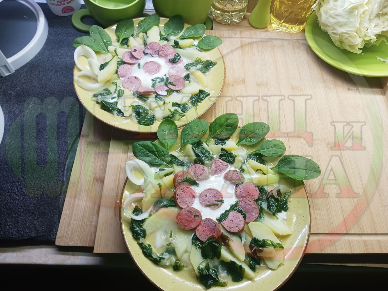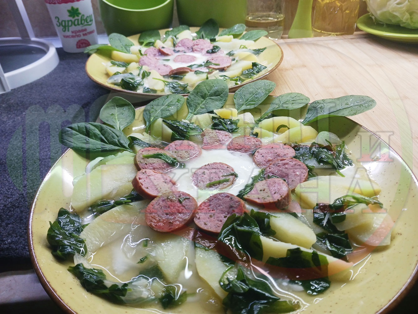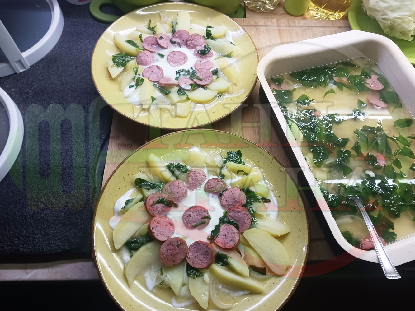 Българска спаначена яхния "Родопсконаденицова спаначенокартофена кромидлучена" приготвена на фурна с родопска наденица, свеж спанак, картофи и кромид лук сурово гарнирана с млечна основа с кисело мляко от България