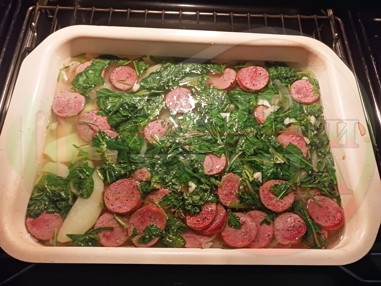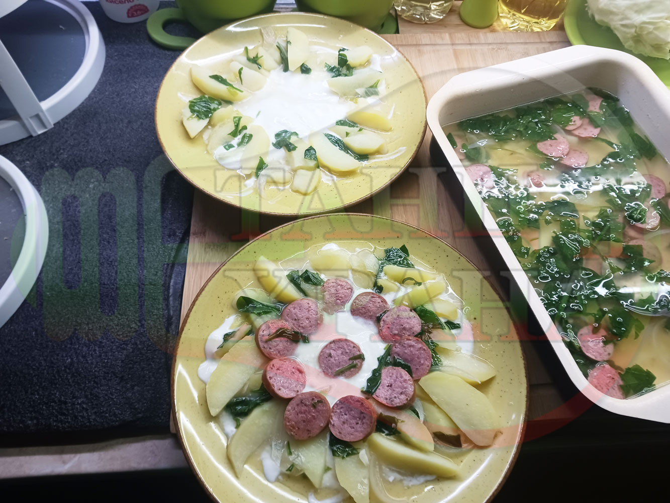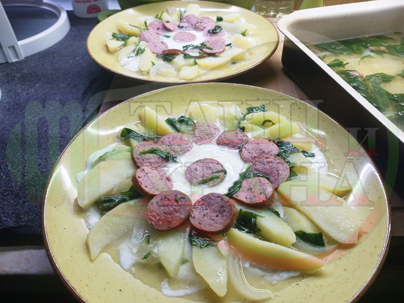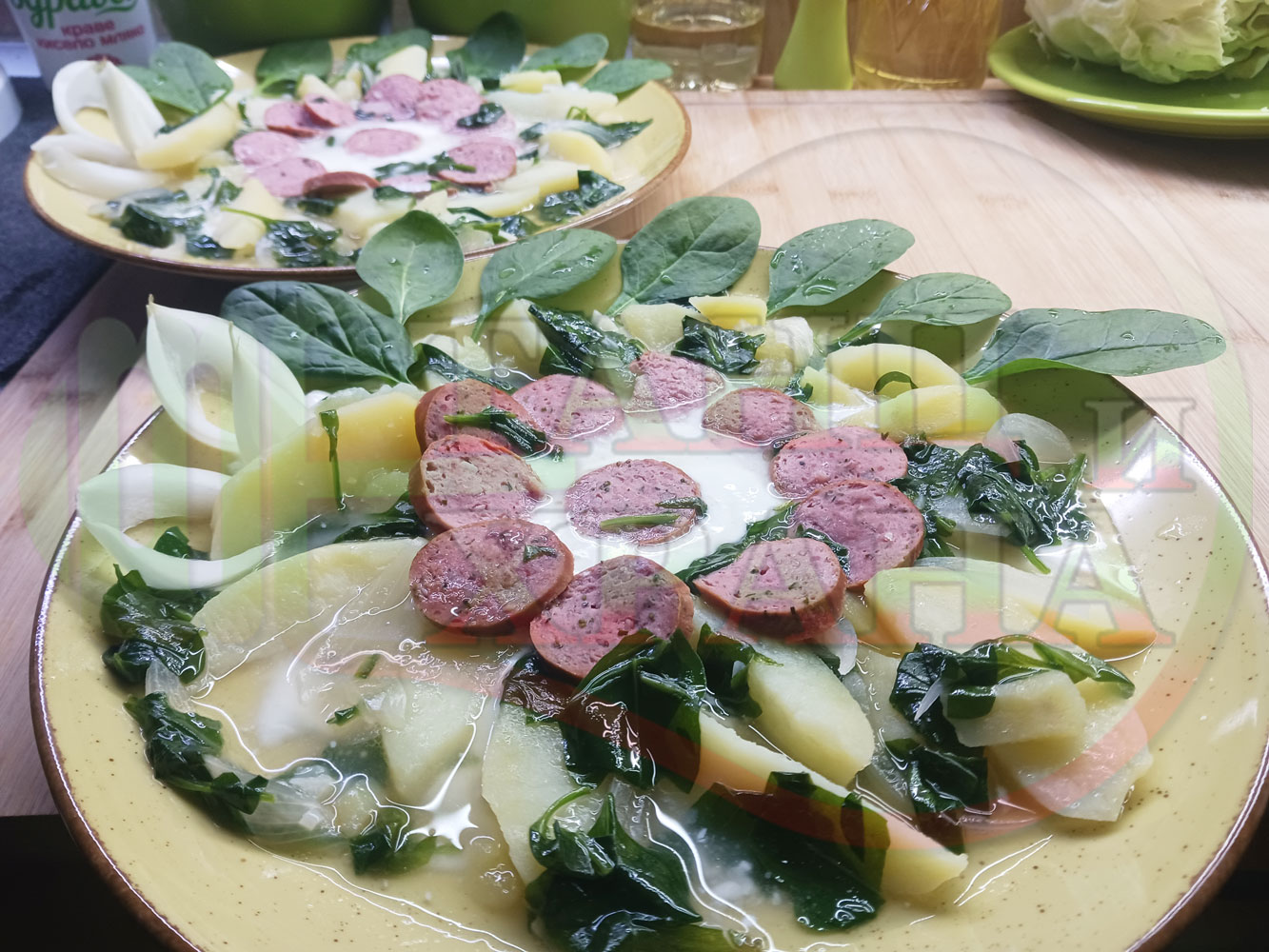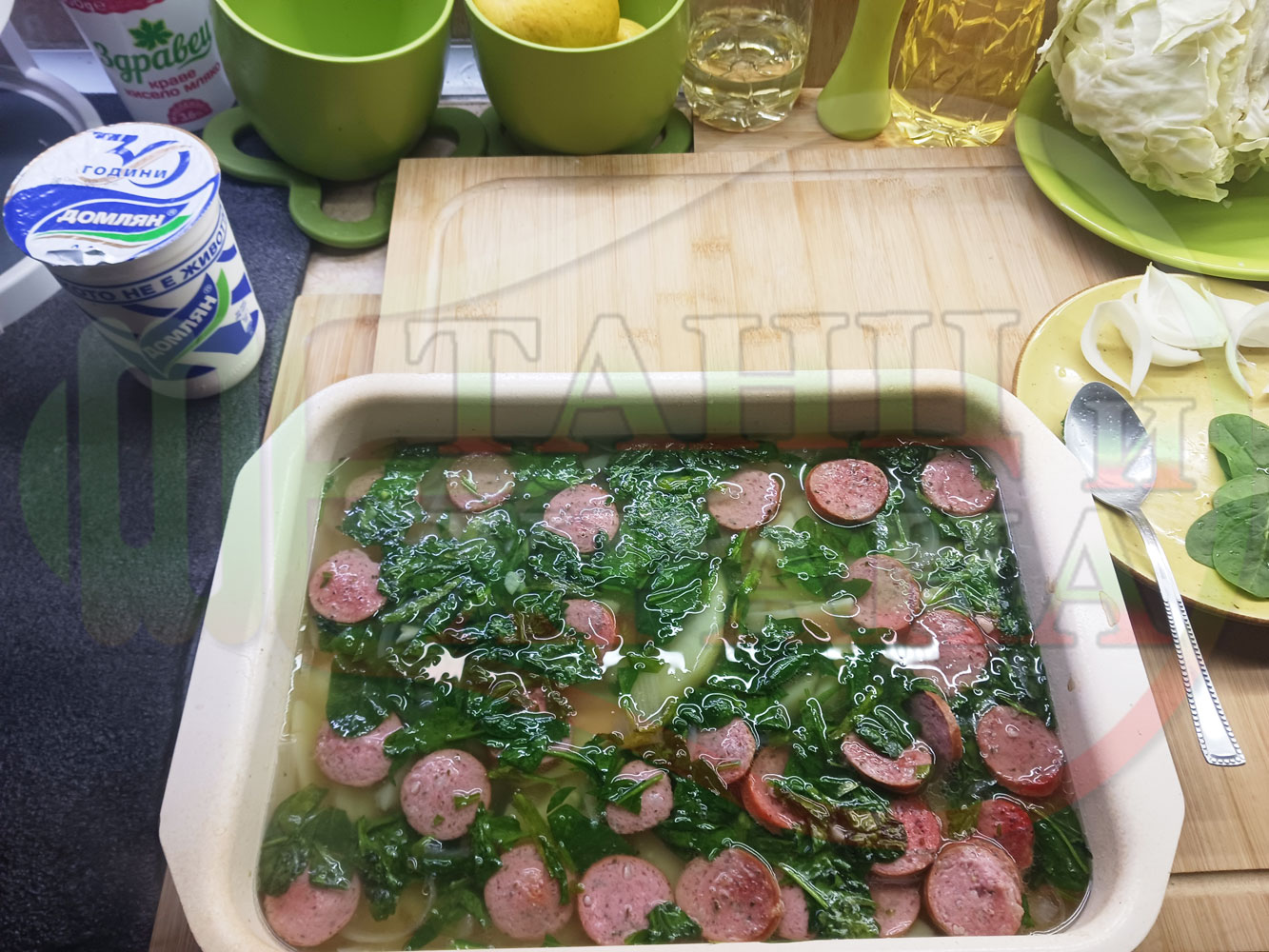 Българска спаначена яхния "Родопсконаденицова спаначенокартофена кромидлучена" приготвена на фурна с родопска наденица, свеж спанак, картофи и кромид лук сурово гарнирана с млечна основа с кисело мляко от България