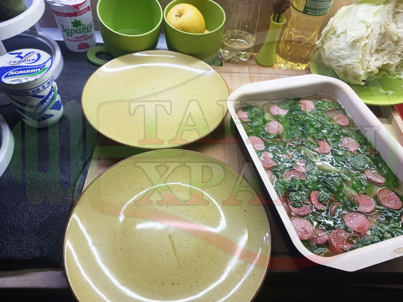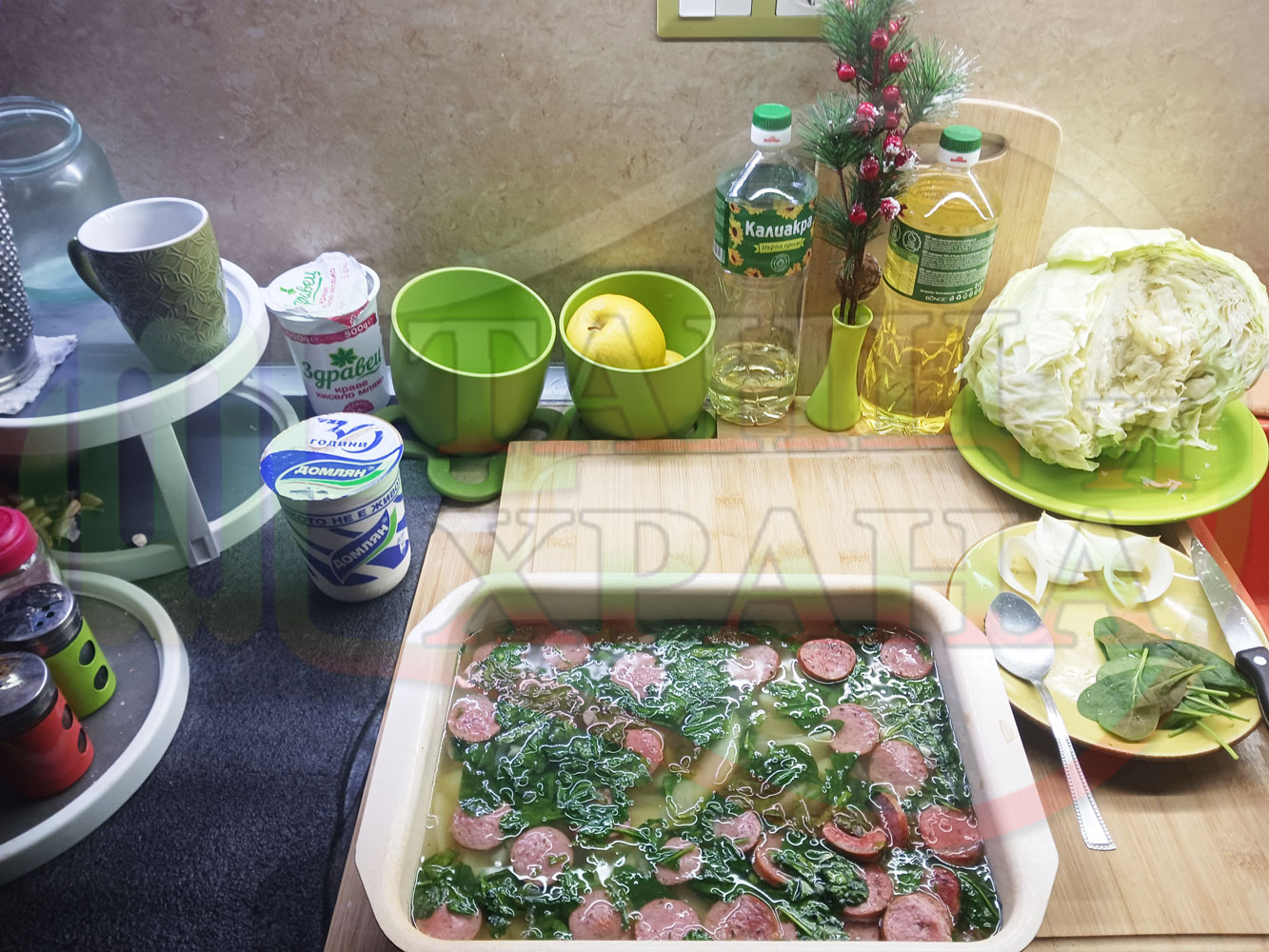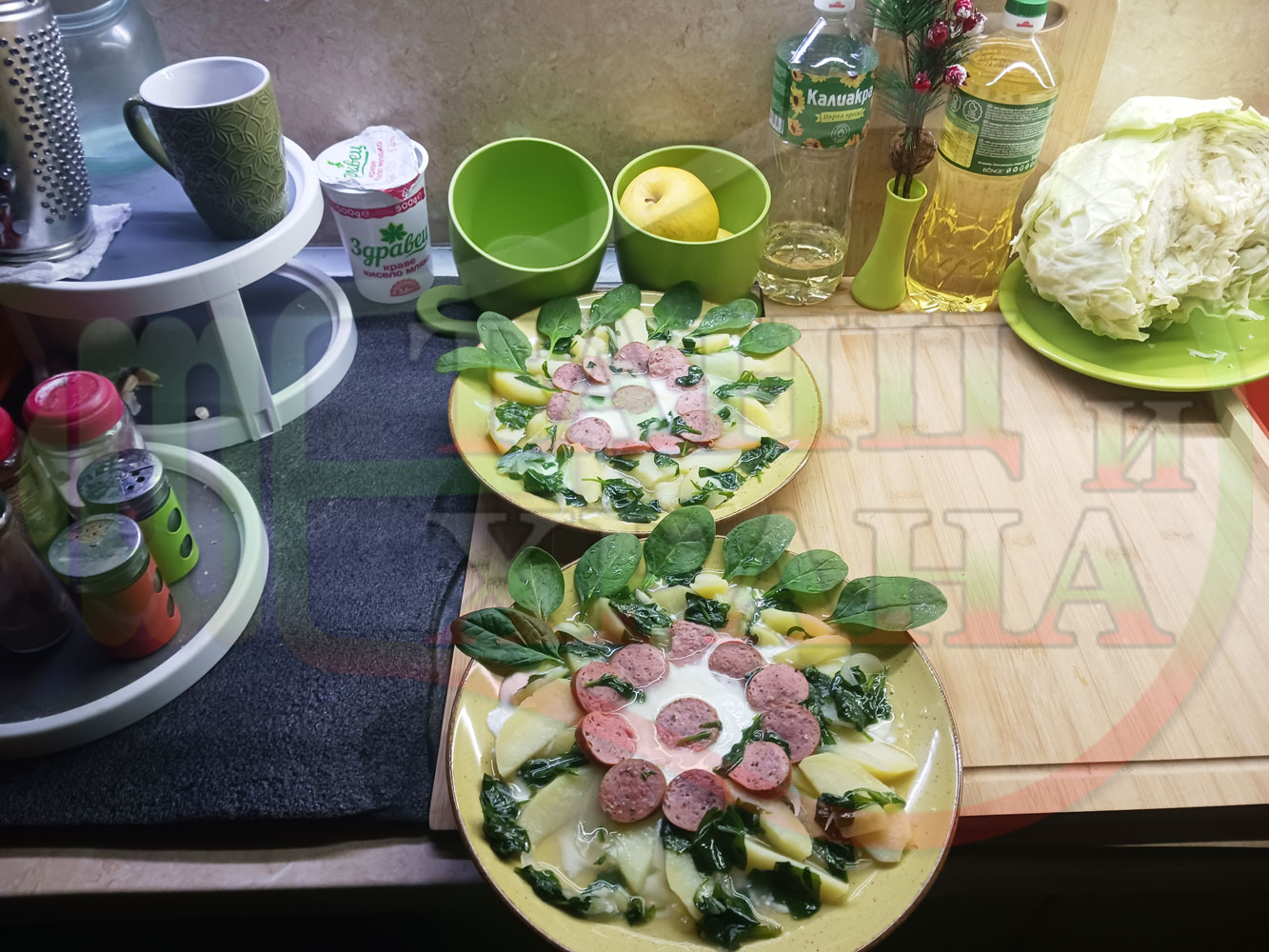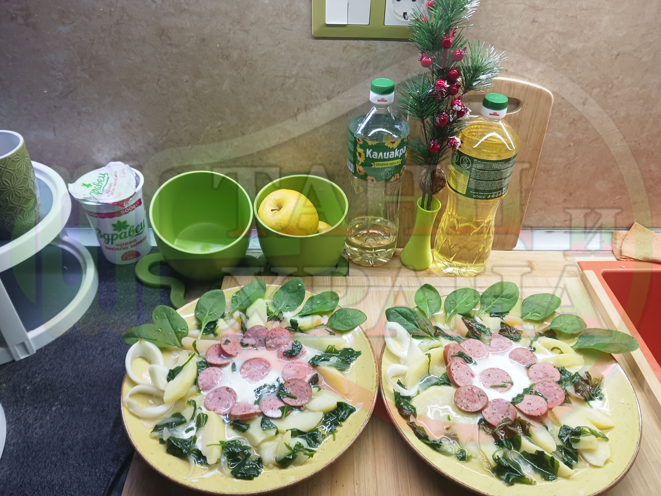 Българска спаначена яхния "Родопсконаденицова спаначенокартофена кромидлучена" приготвена на фурна с родопска наденица, свеж спанак, картофи и кромид лук сурово гарнирана с млечна основа с кисело мляко от България