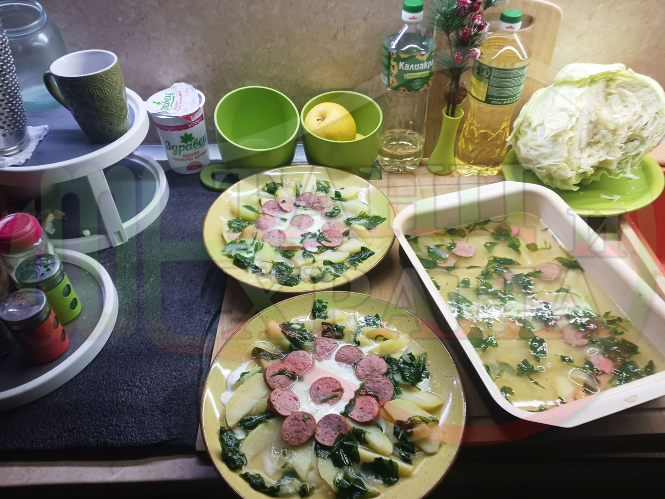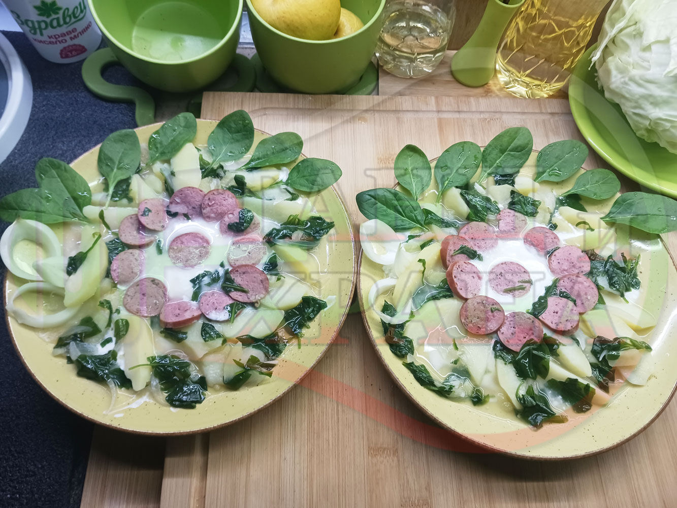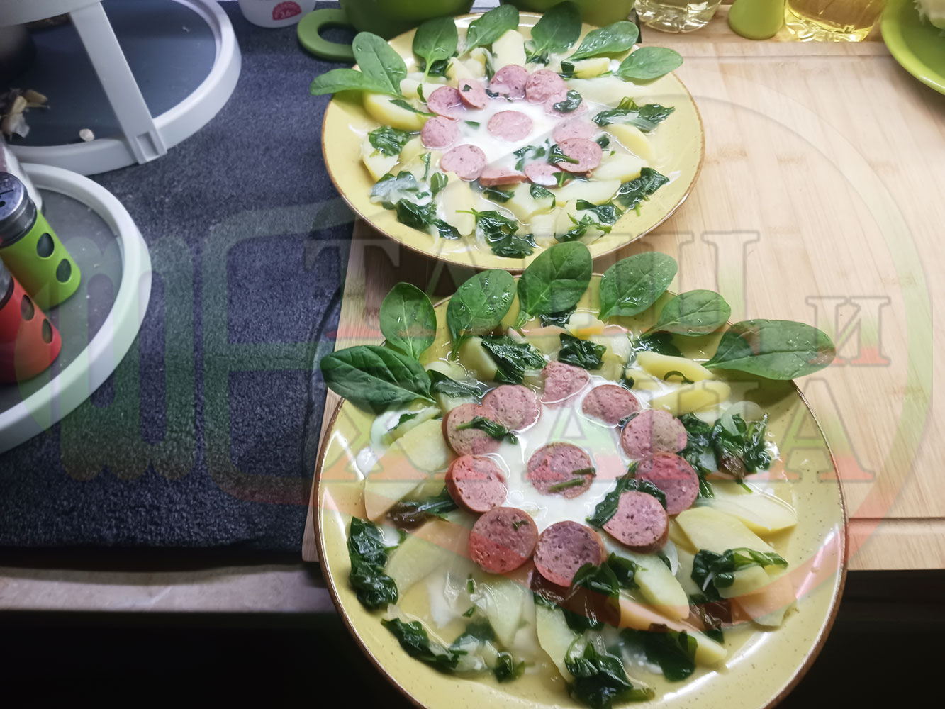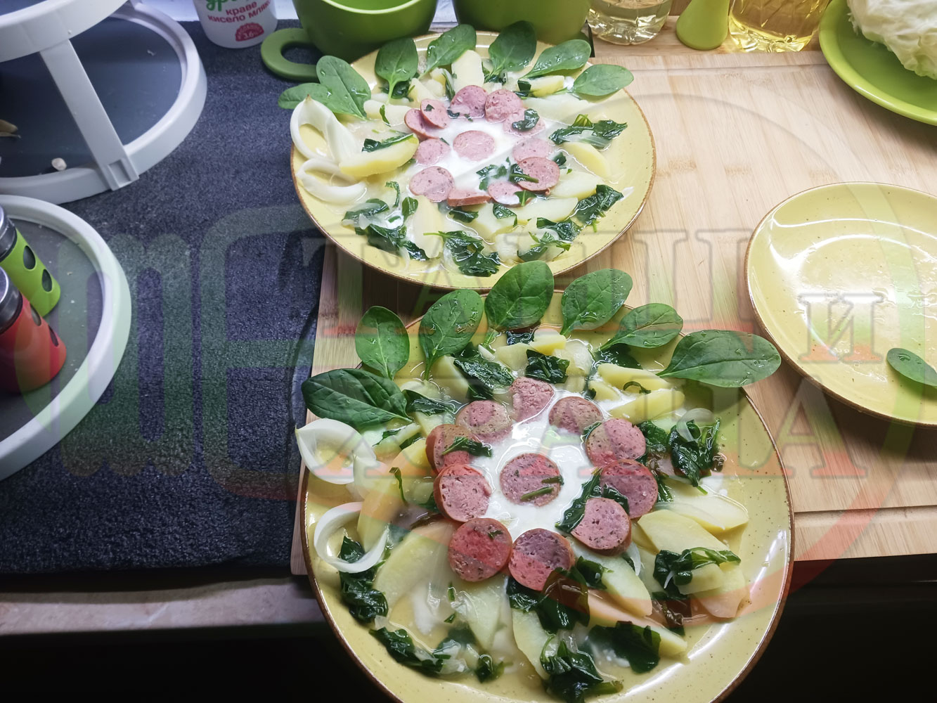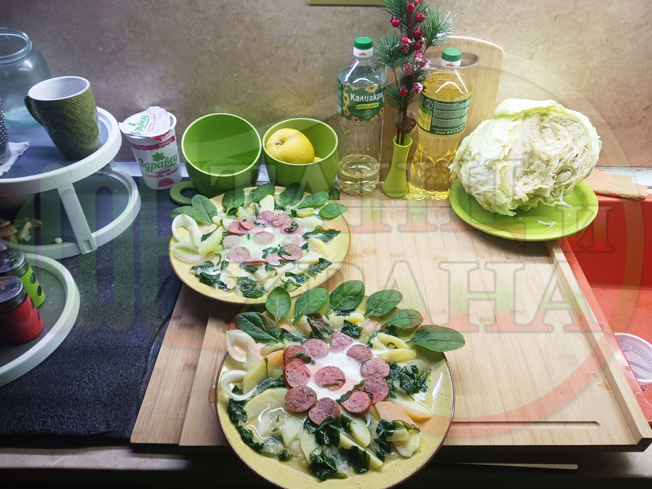 Българска спаначена яхния "Родопсконаденицова спаначенокартофена кромидлучена" приготвена на фурна с родопска наденица, свеж спанак, картофи и кромид лук сурово гарнирана с млечна основа с кисело мляко от България