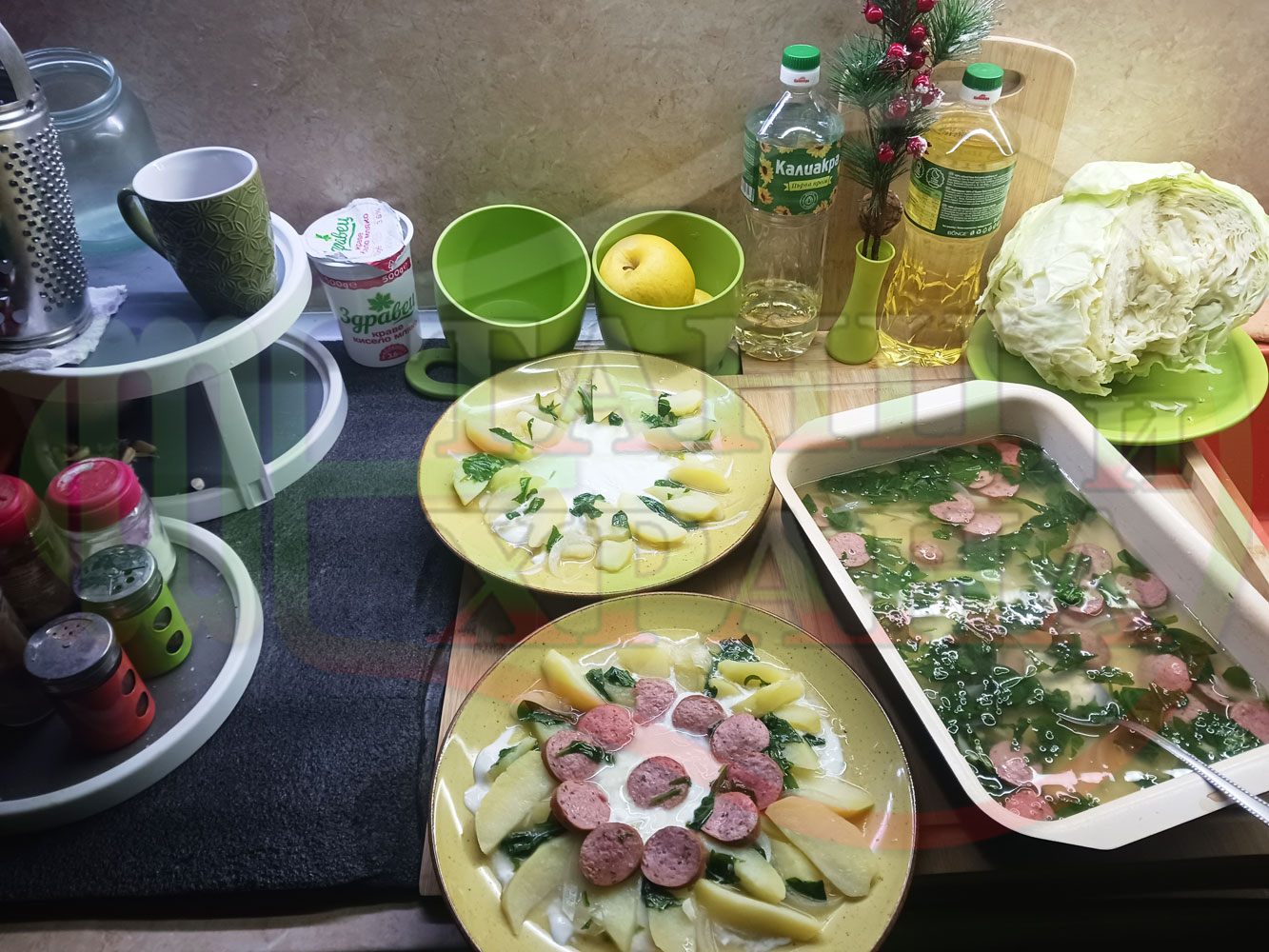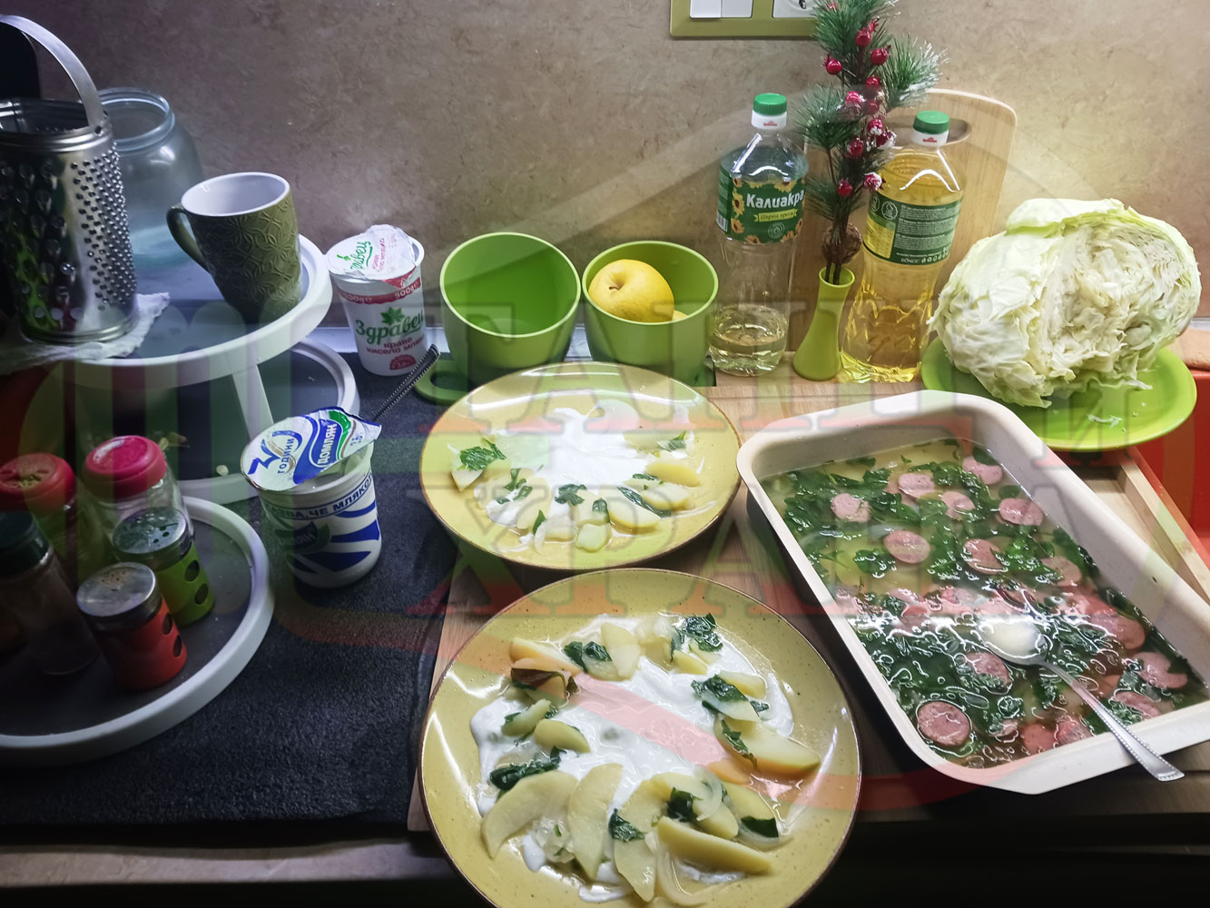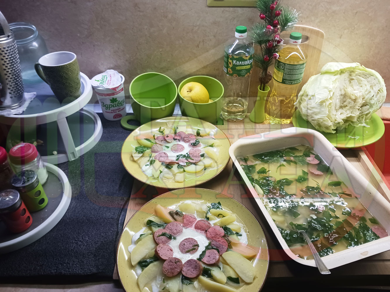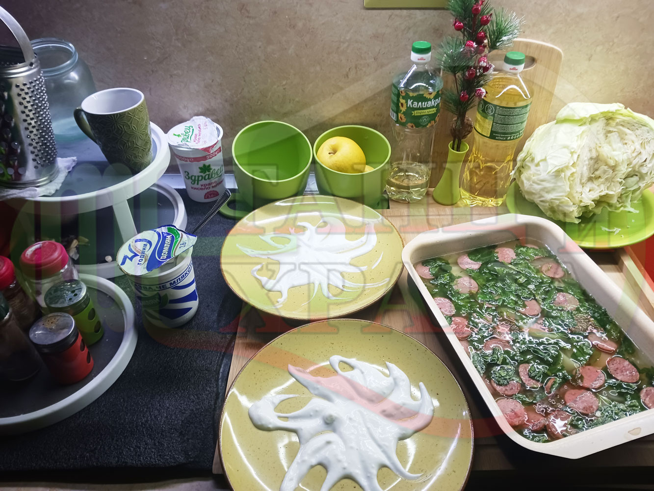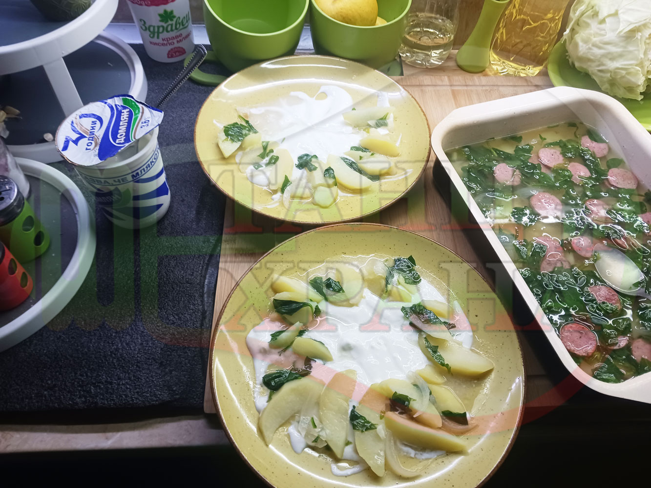 Българска спаначена яхния "Родопсконаденицова спаначенокартофена кромидлучена" приготвена на фурна с родопска наденица, свеж спанак, картофи и кромид лук сурово гарнирана с млечна основа с кисело мляко от България