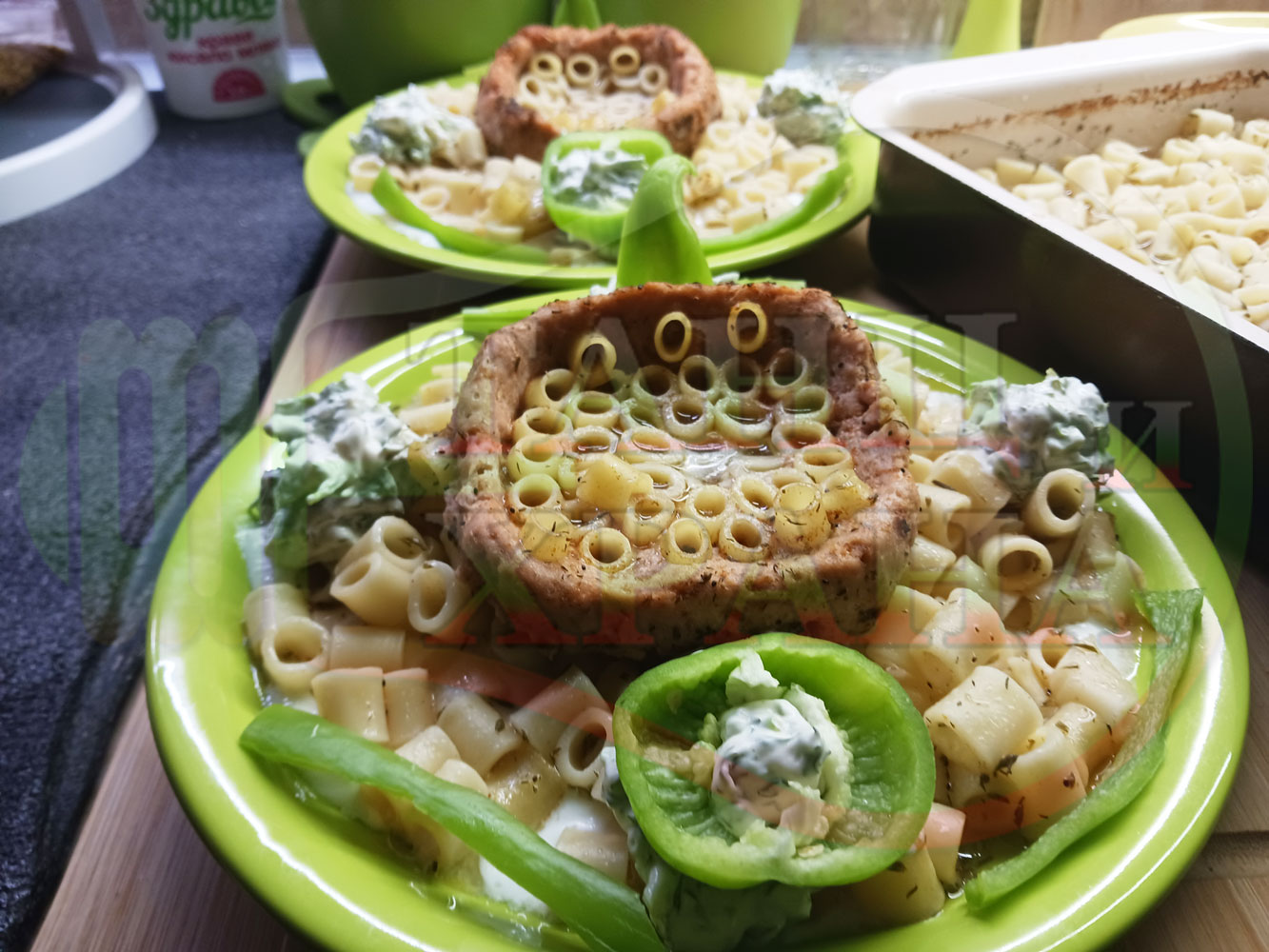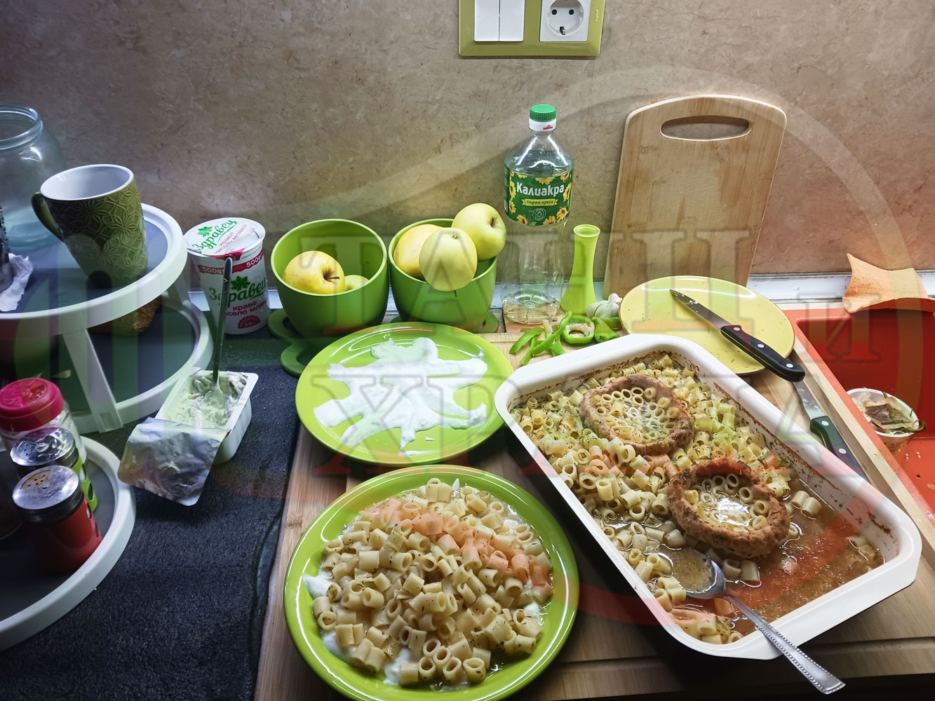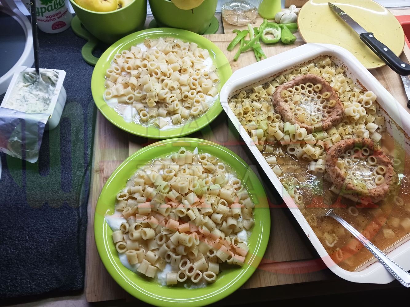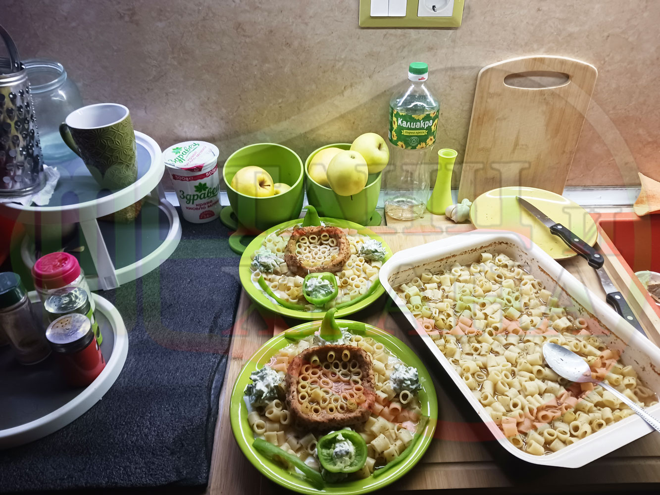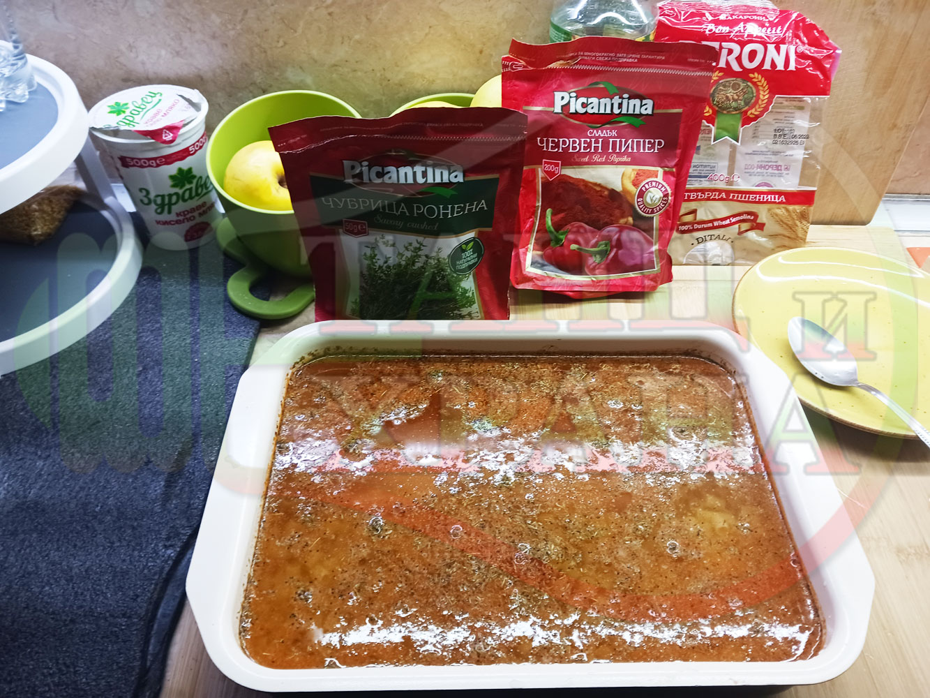 В мой си стил все нещо ми се ще да пробода, набода и т.н., та така и спретнах изключително вкусни макарони с квадратни, каймяни кюфтета от неовкусена, свинска кайма. Оформих квадратните кюфтета като кладенчета, набодох ги с късите макарони и ги сварих заедно с макароните, ронената чубрица и червения сладък пипер. Макароните се получиха изключително вкусни, обогатени със суровия майонезения копъров крем, приготвен от трапезна майонеза, свеж копър и стар чесън и с млечната основа от българско кисело мляко. Отново спретнах невероятна вкусно, вкусна, вкусотия (вкуснотия). ![]()