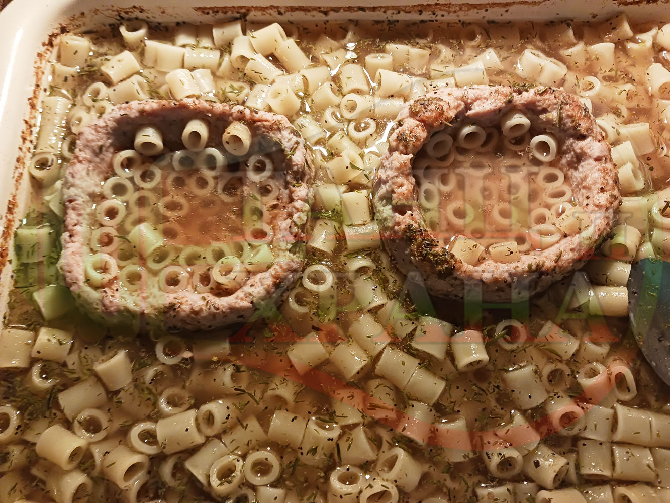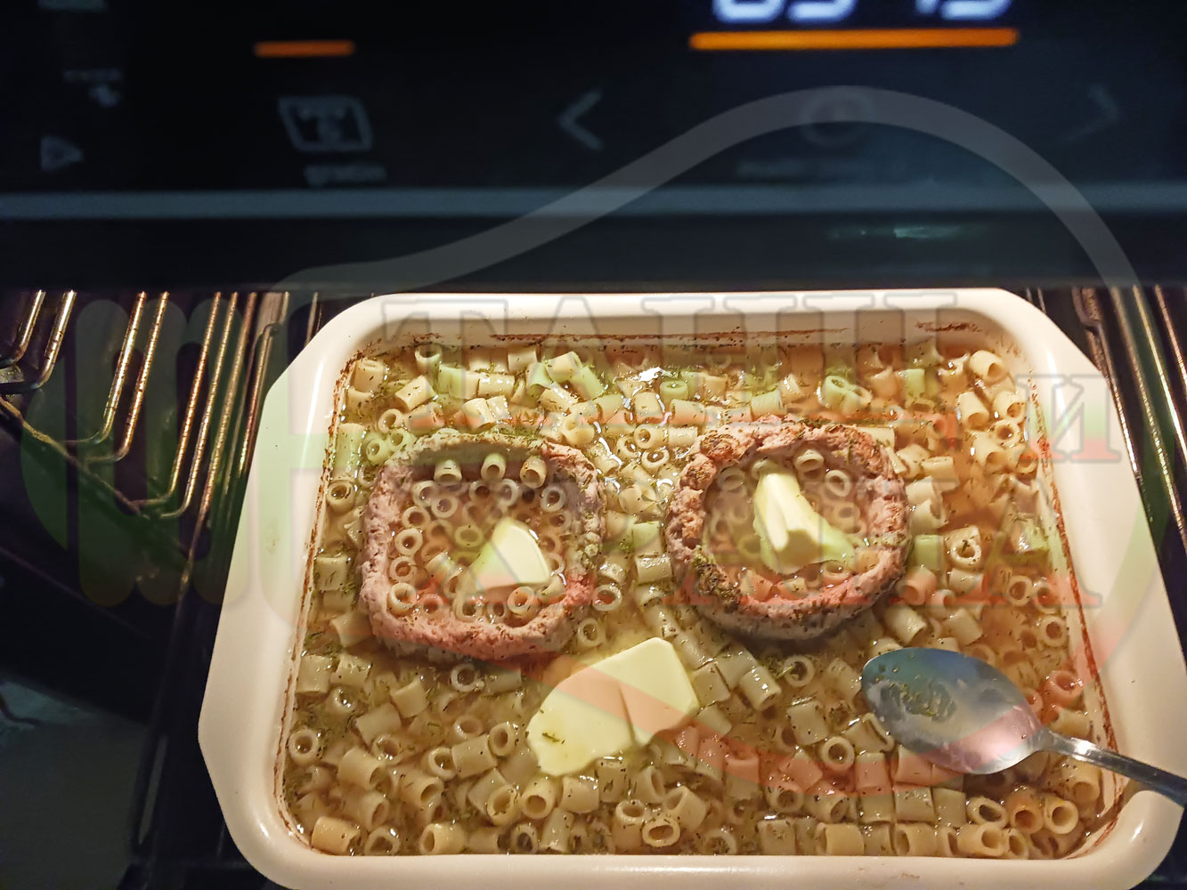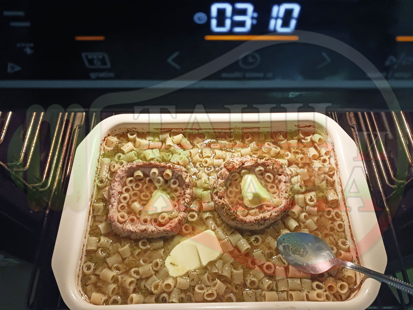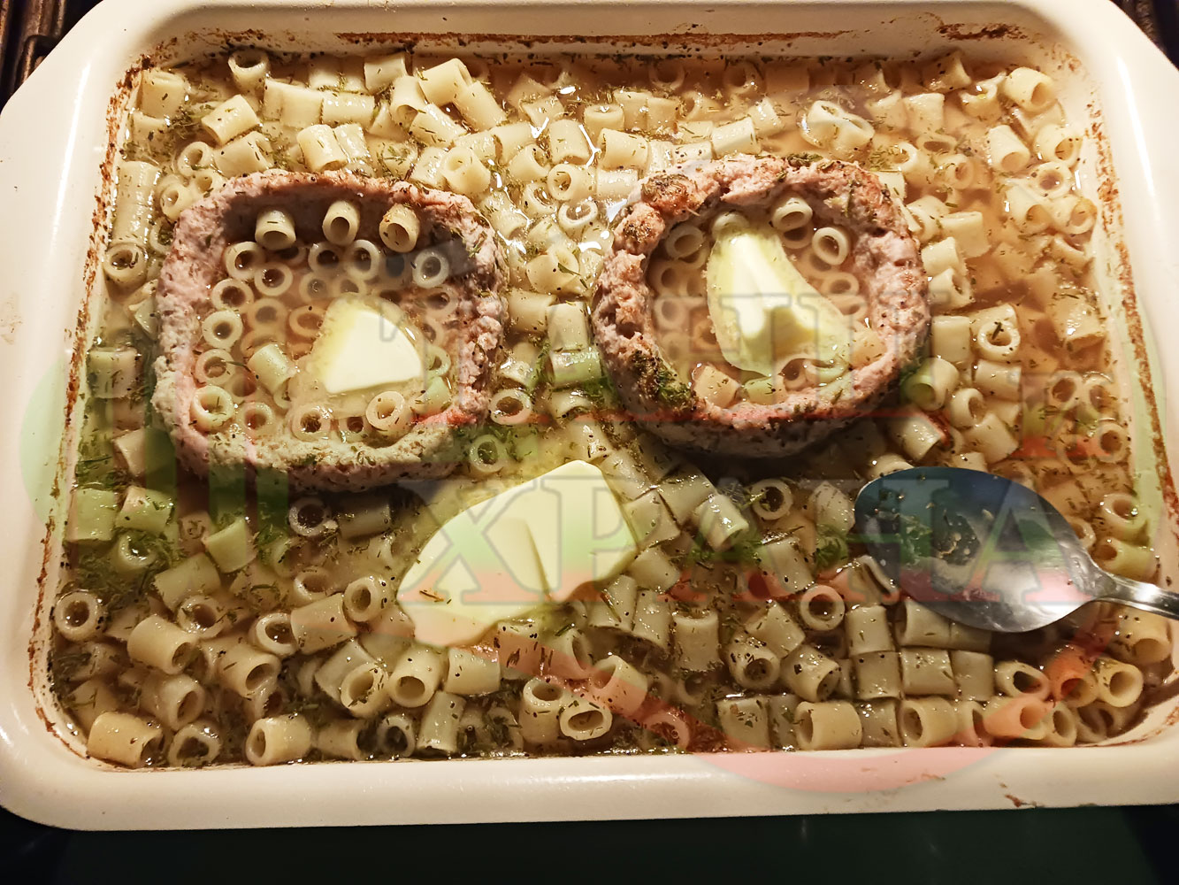 Добавете нарязано на тънки парченца краве масло в квадратните, кладенчови кюфтета и около тях върху макароните около 5 минути преди края на зададеното време и дозапечете до желаната от вас степен (средно запечени кюфтета или по-запечени кюфтета и разварени макарони).