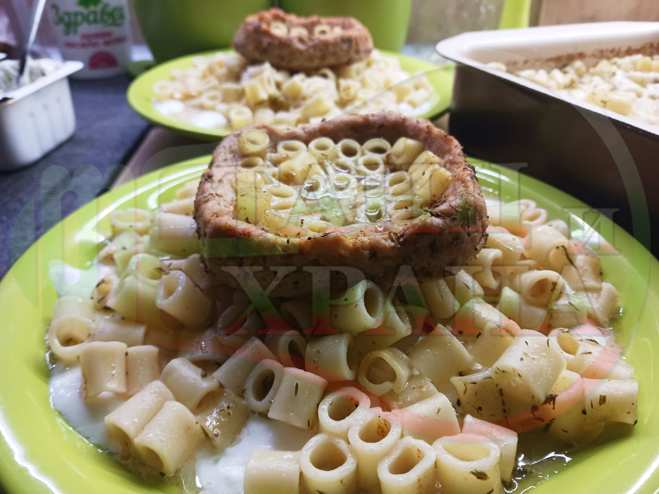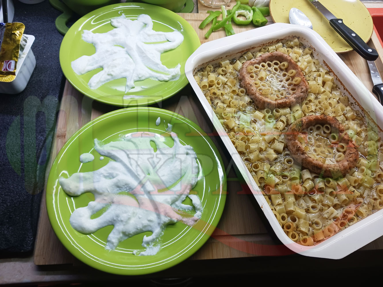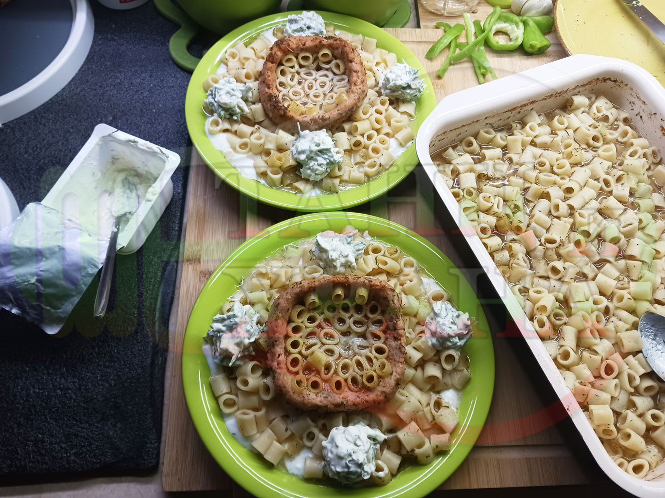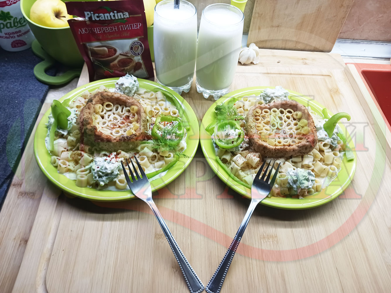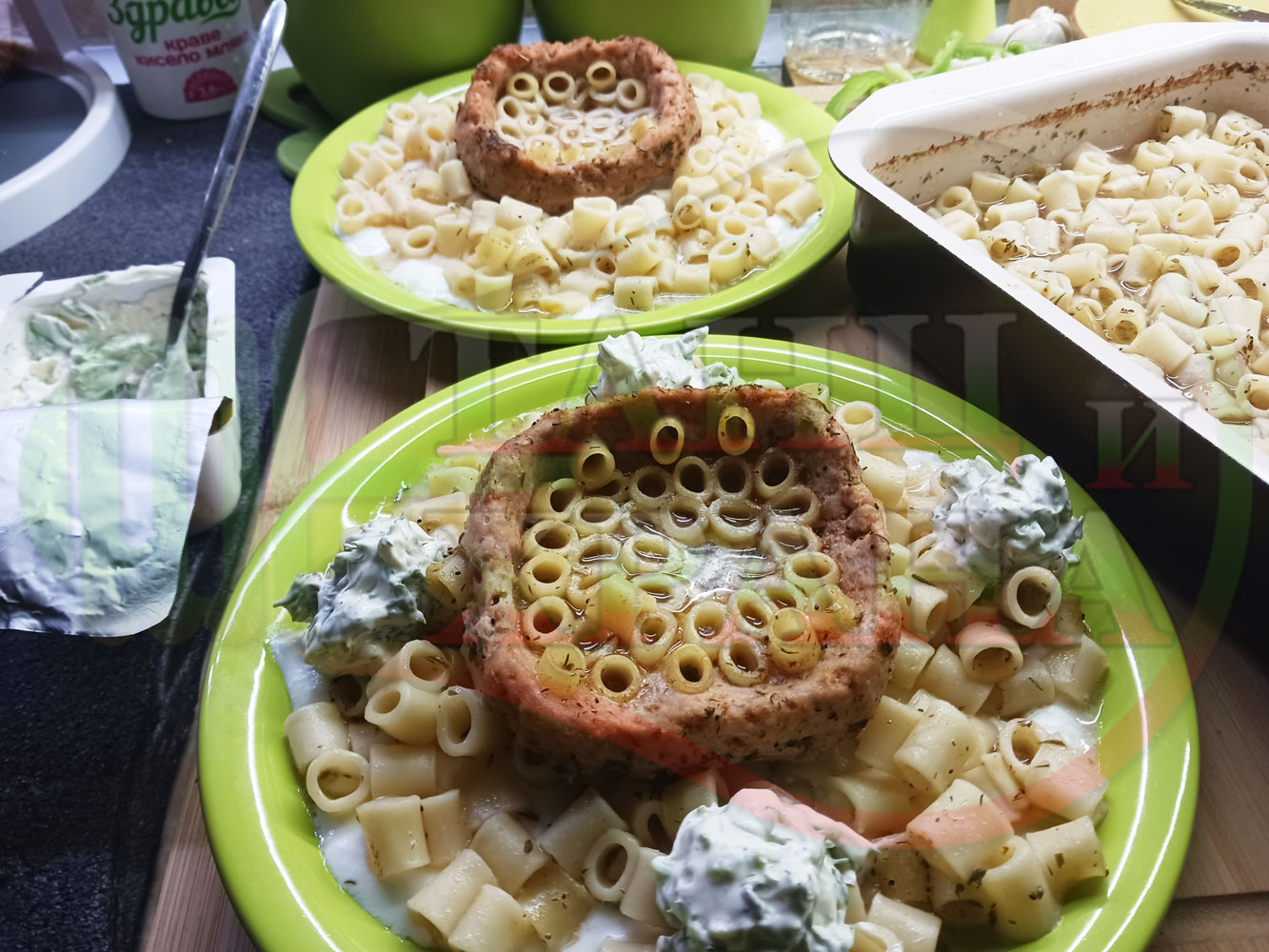 Български къси макарони "Каймянопрободни майонезенокопърови киселомлечни" сварени на фурна с квадратни кюфтета от кайма, ронена чубрица и червен сладък пипер гарнирани с крем от майонеза, копър и чесън и кисело мляко от България - двукомпонентни