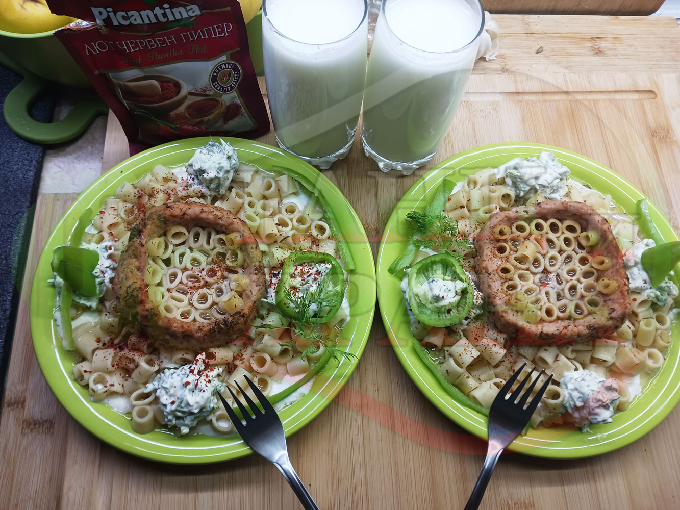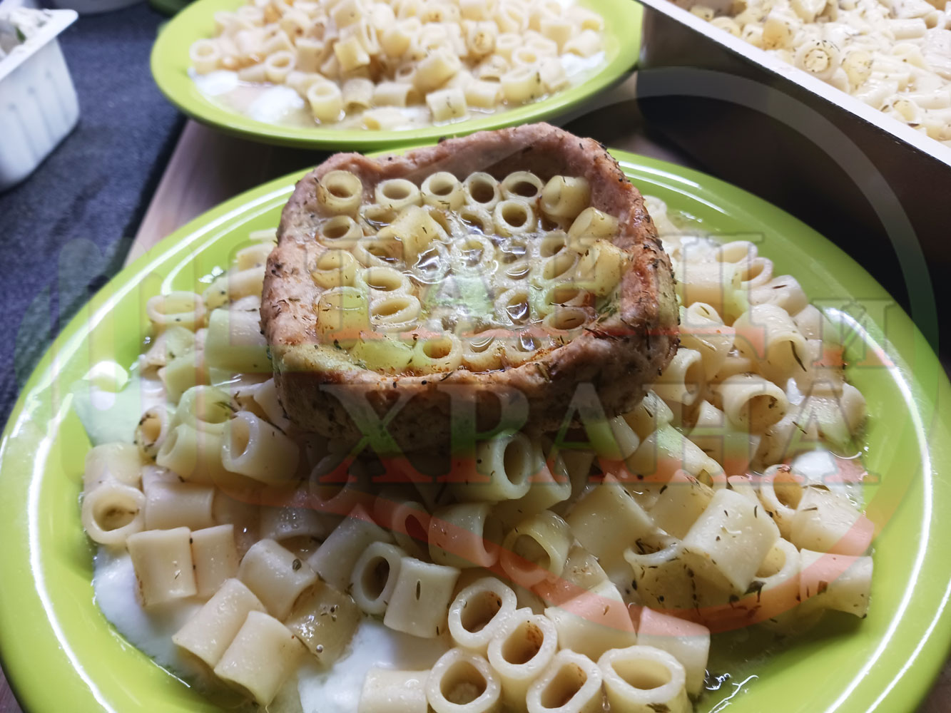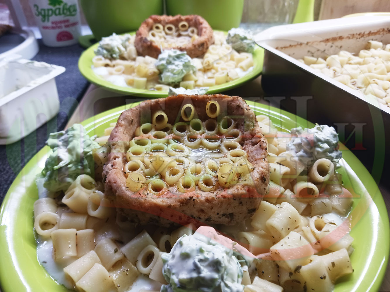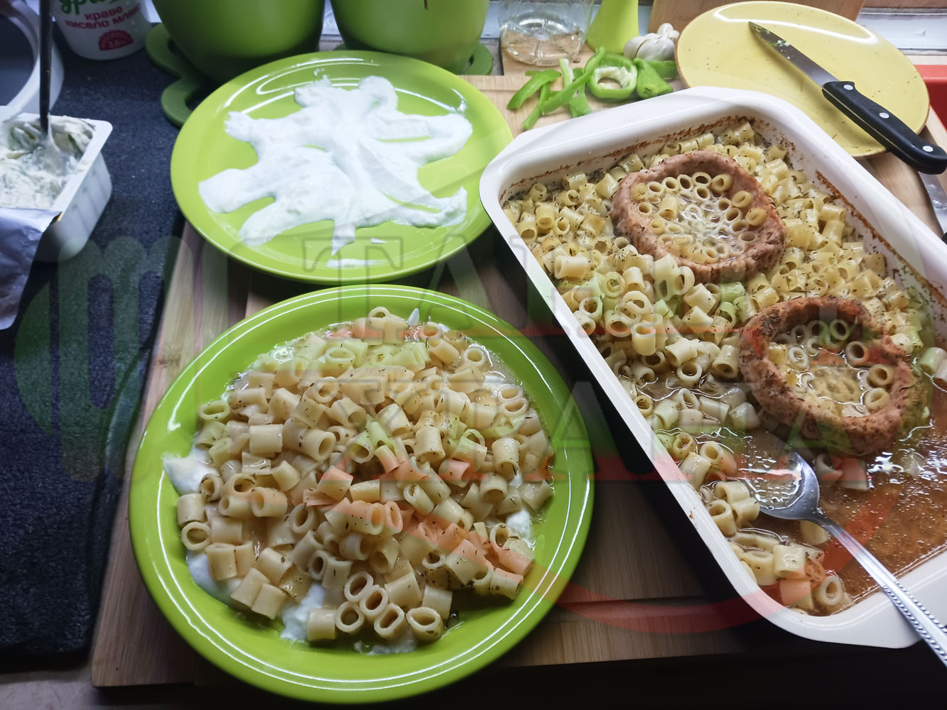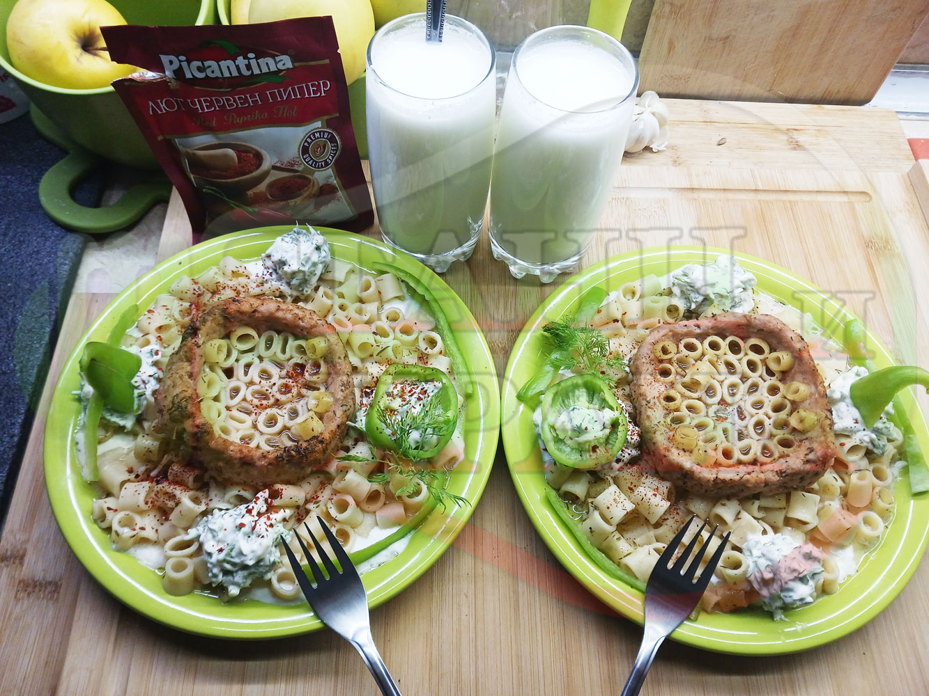 Български къси макарони "Каймянопрободни майонезенокопърови киселомлечни" сварени на фурна с квадратни кюфтета от кайма, ронена чубрица и червен сладък пипер гарнирани с крем от майонеза, копър и чесън и кисело мляко от България - двукомпонентни