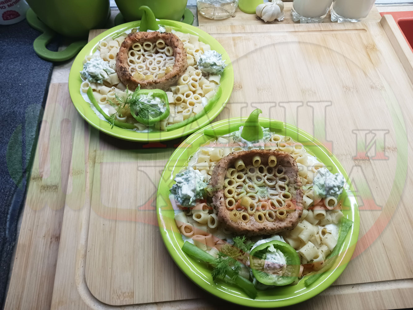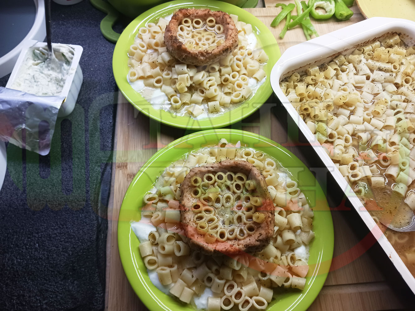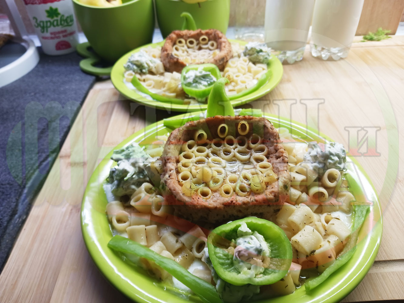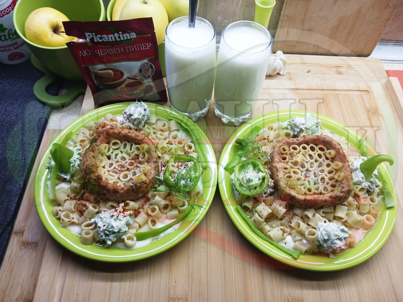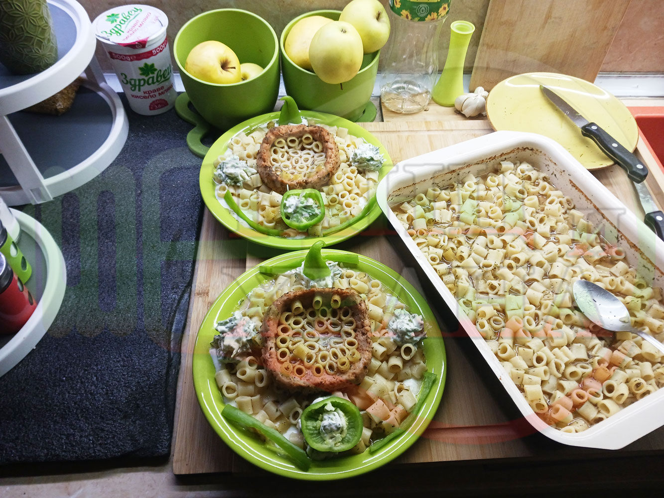 Български къси макарони "Каймянопрободни майонезенокопърови киселомлечни" сварени на фурна с квадратни кюфтета от кайма, ронена чубрица и червен сладък пипер гарнирани с крем от майонеза, копър и чесън и кисело мляко от България - двукомпонентни