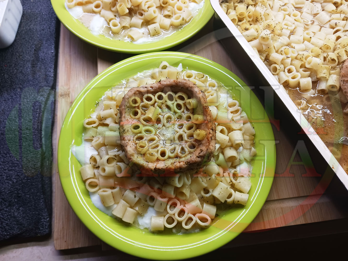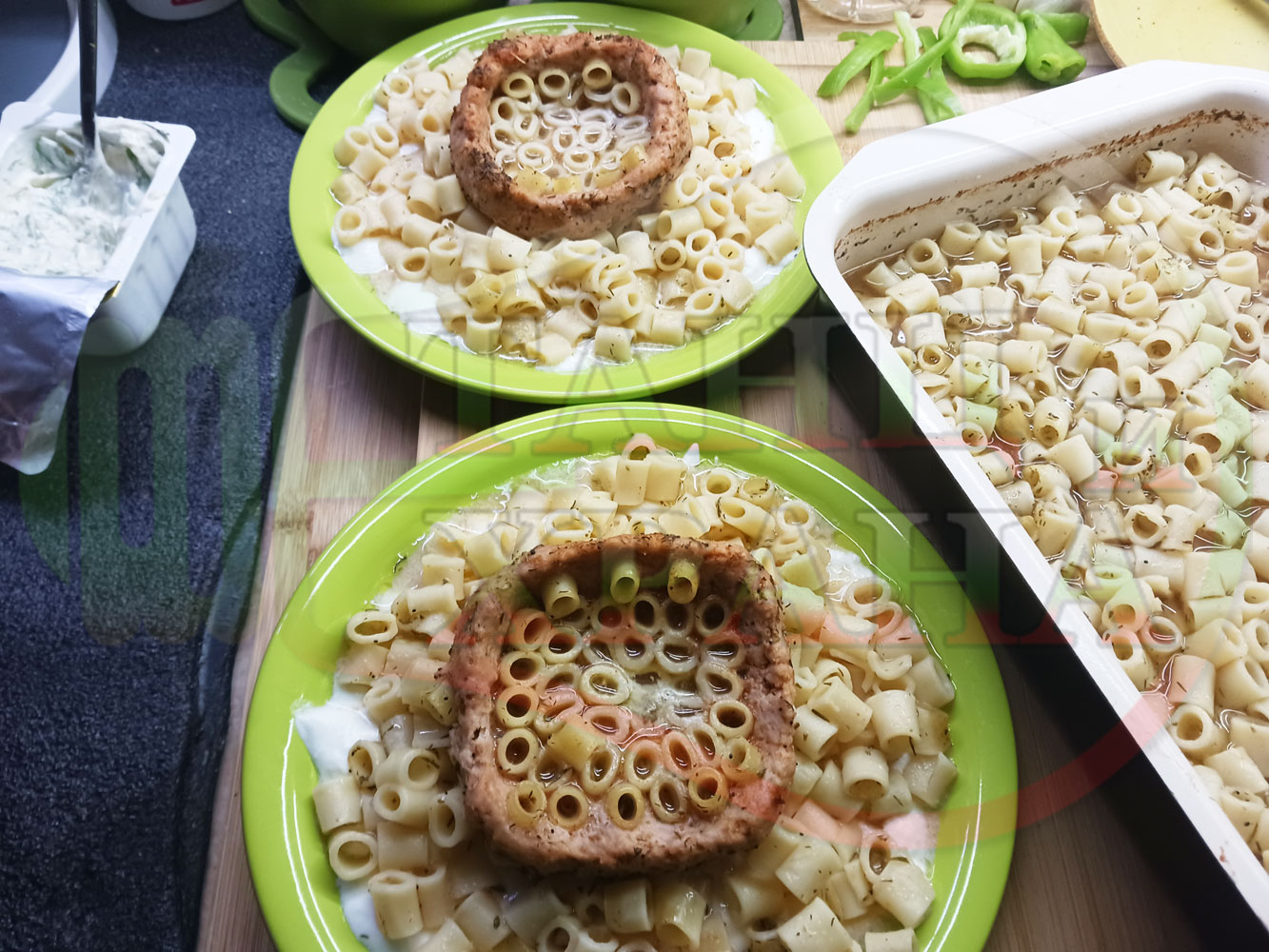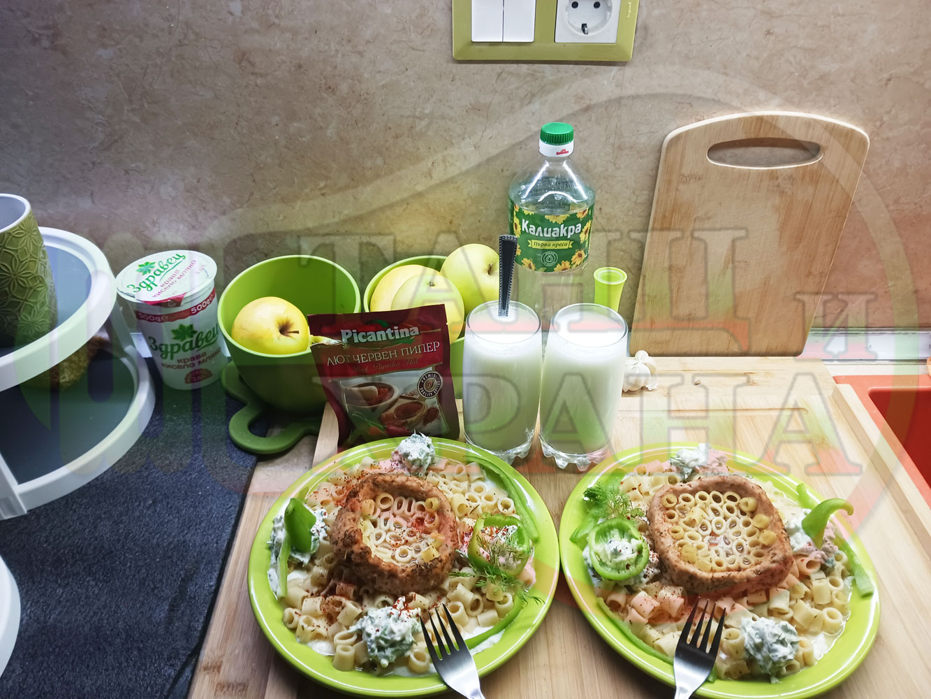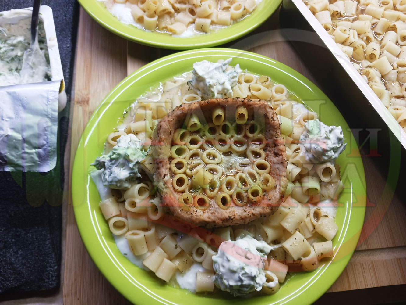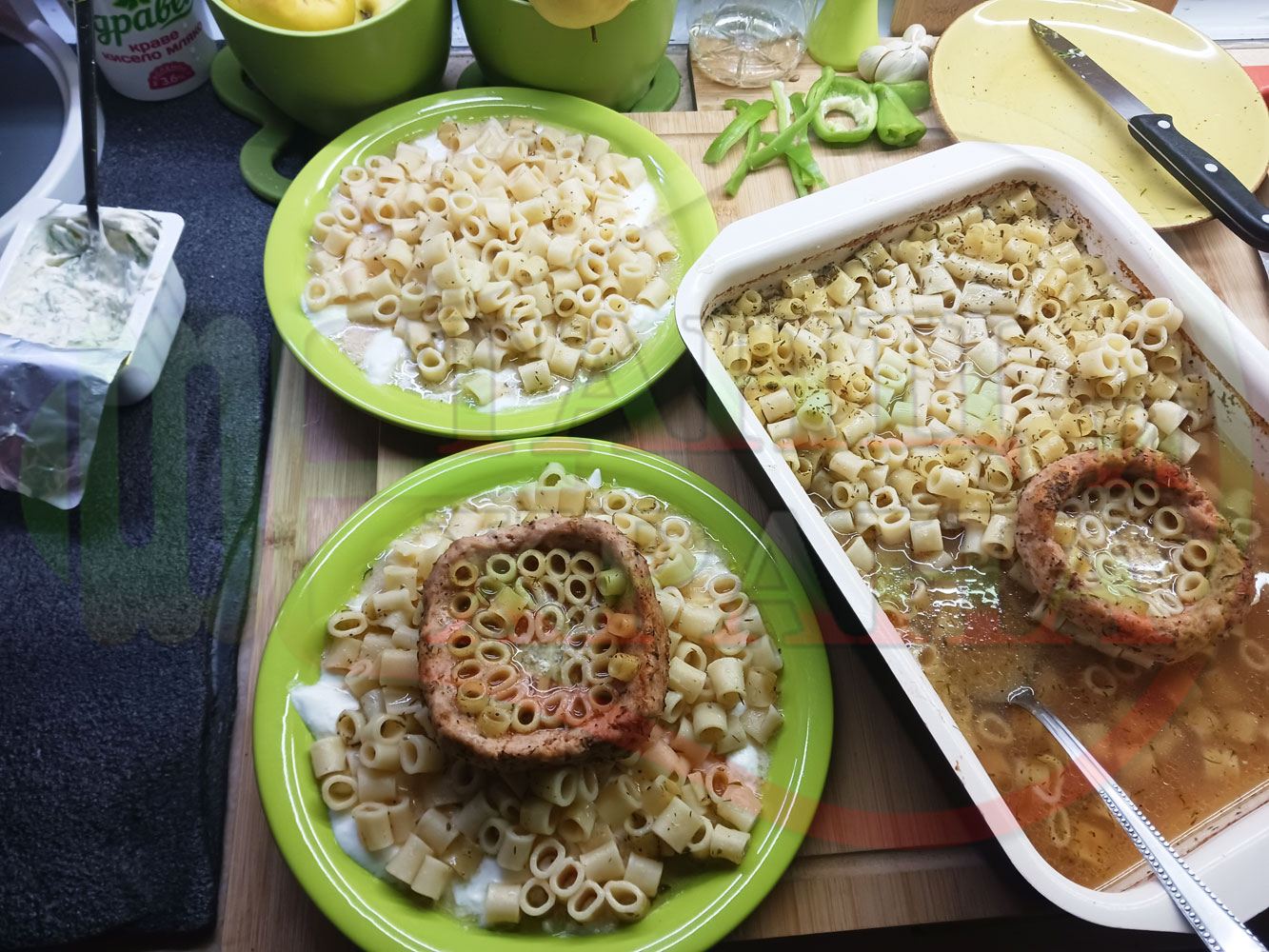 Български къси макарони "Каймянопрободни майонезенокопърови киселомлечни" сварени на фурна с квадратни кюфтета от кайма, ронена чубрица и червен сладък пипер гарнирани с крем от майонеза, копър и чесън и кисело мляко от България - двукомпонентни
