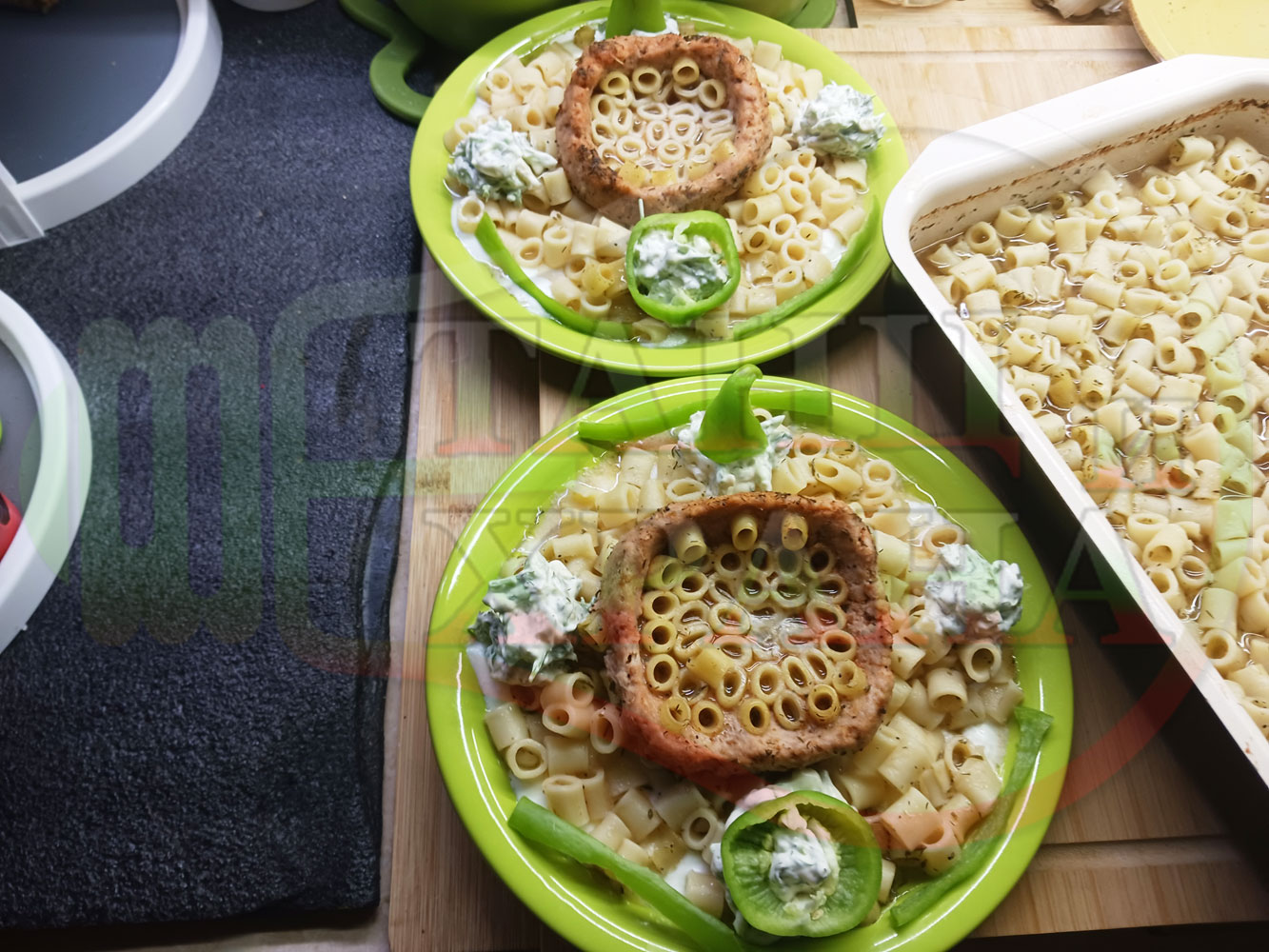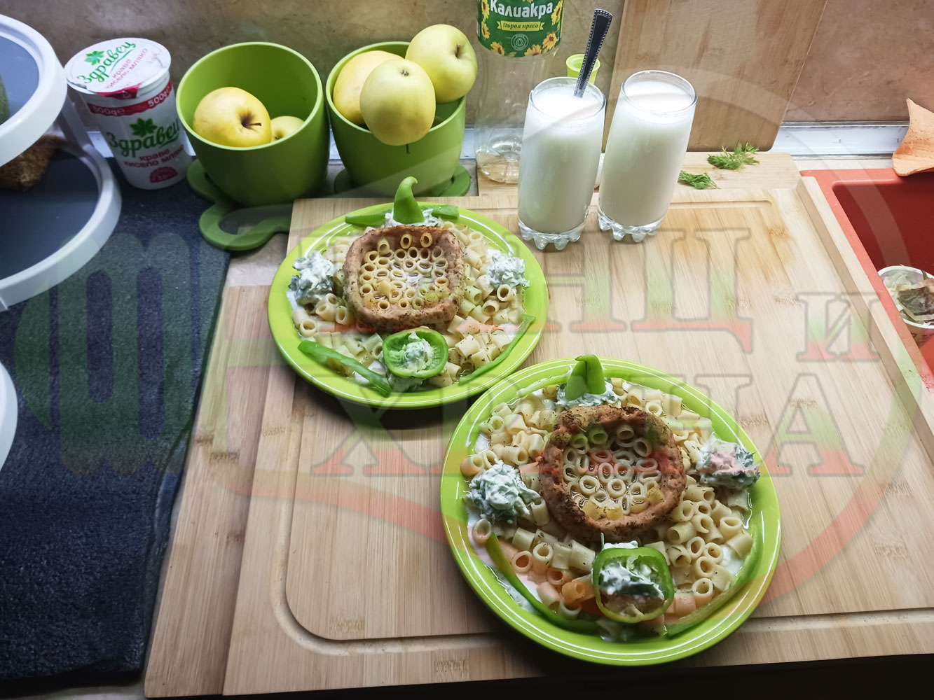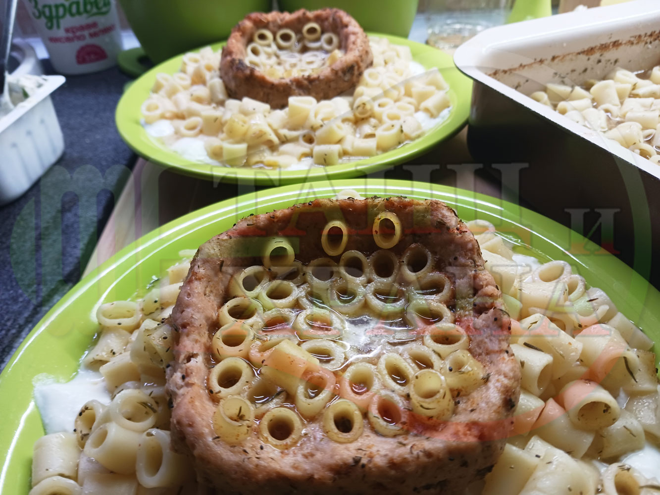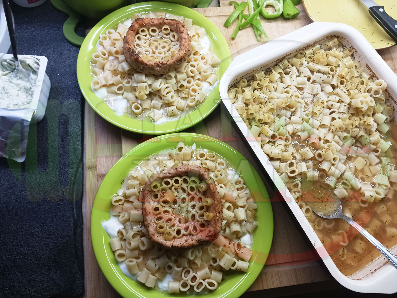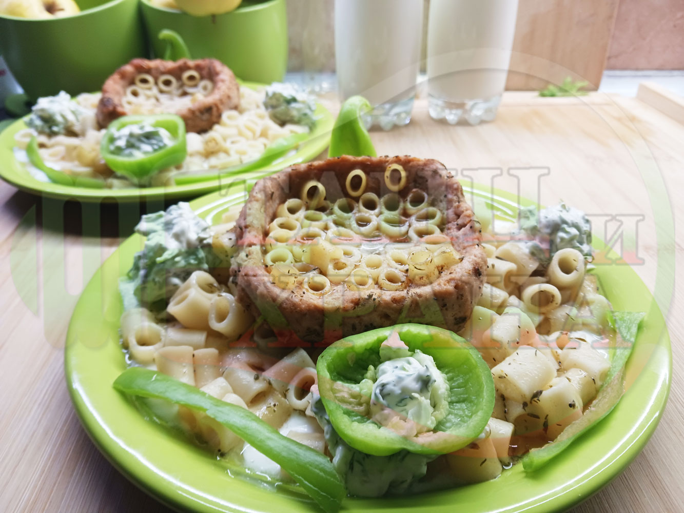 Български къси макарони "Каймянопрободни майонезенокопърови киселомлечни" сварени на фурна с квадратни кюфтета от кайма, ронена чубрица и червен сладък пипер гарнирани с крем от майонеза, копър и чесън и кисело мляко от България - двукомпонентни