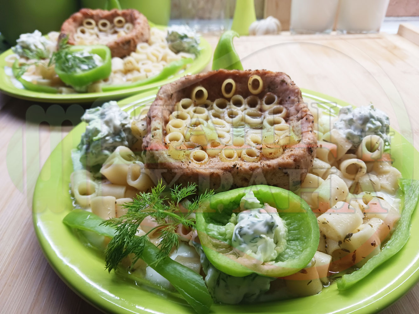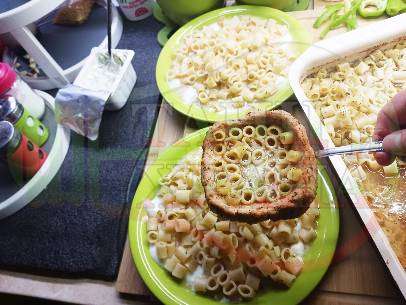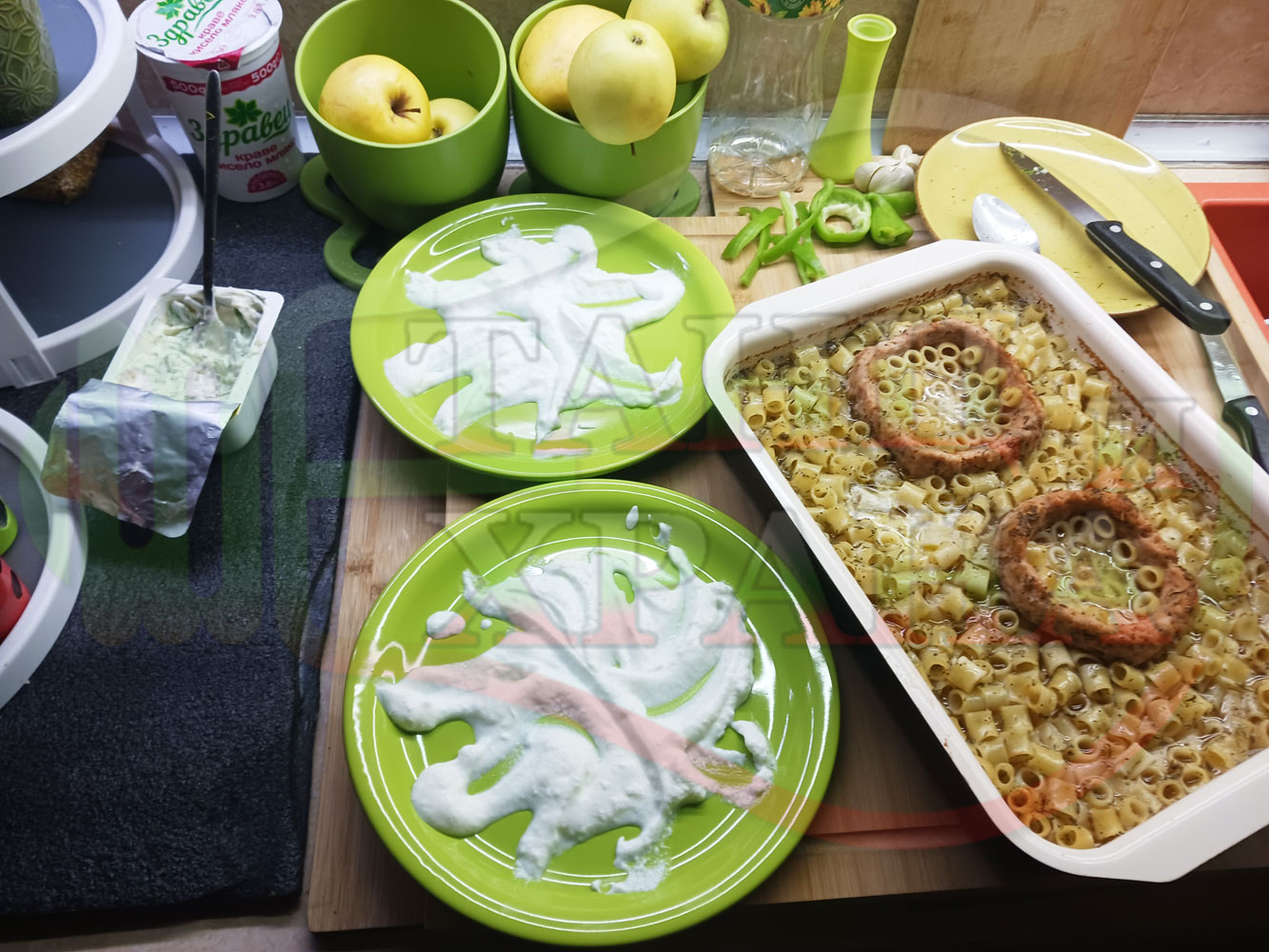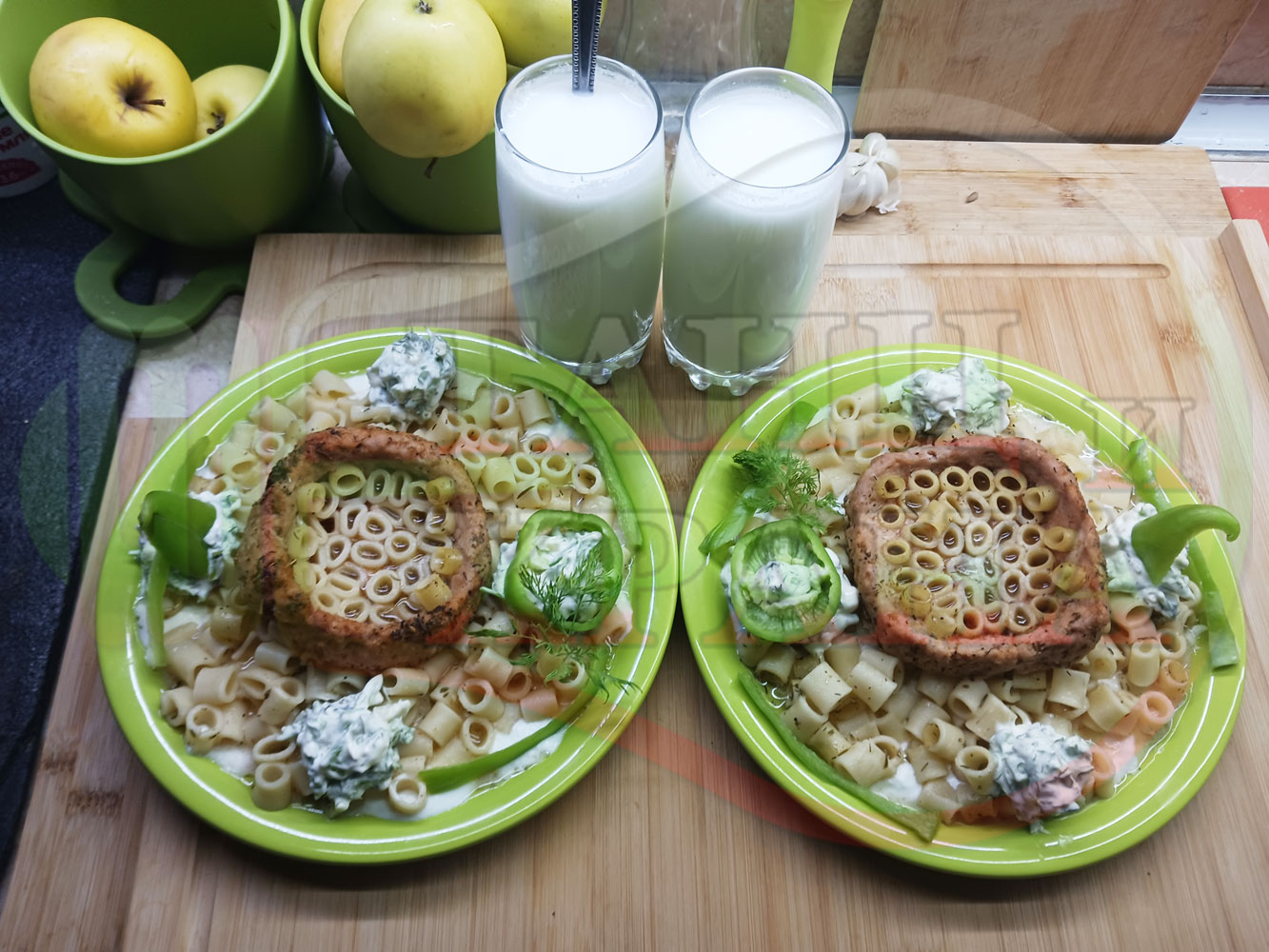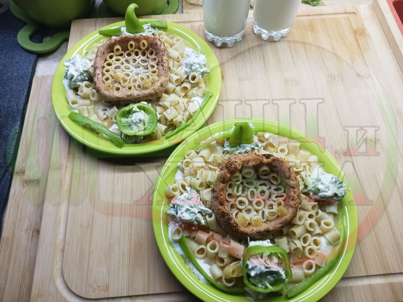 Български къси макарони "Каймянопрободни майонезенокопърови киселомлечни" сварени на фурна с квадратни кюфтета от кайма, ронена чубрица и червен сладък пипер гарнирани с крем от майонеза, копър и чесън и кисело мляко от България - двукомпонентни