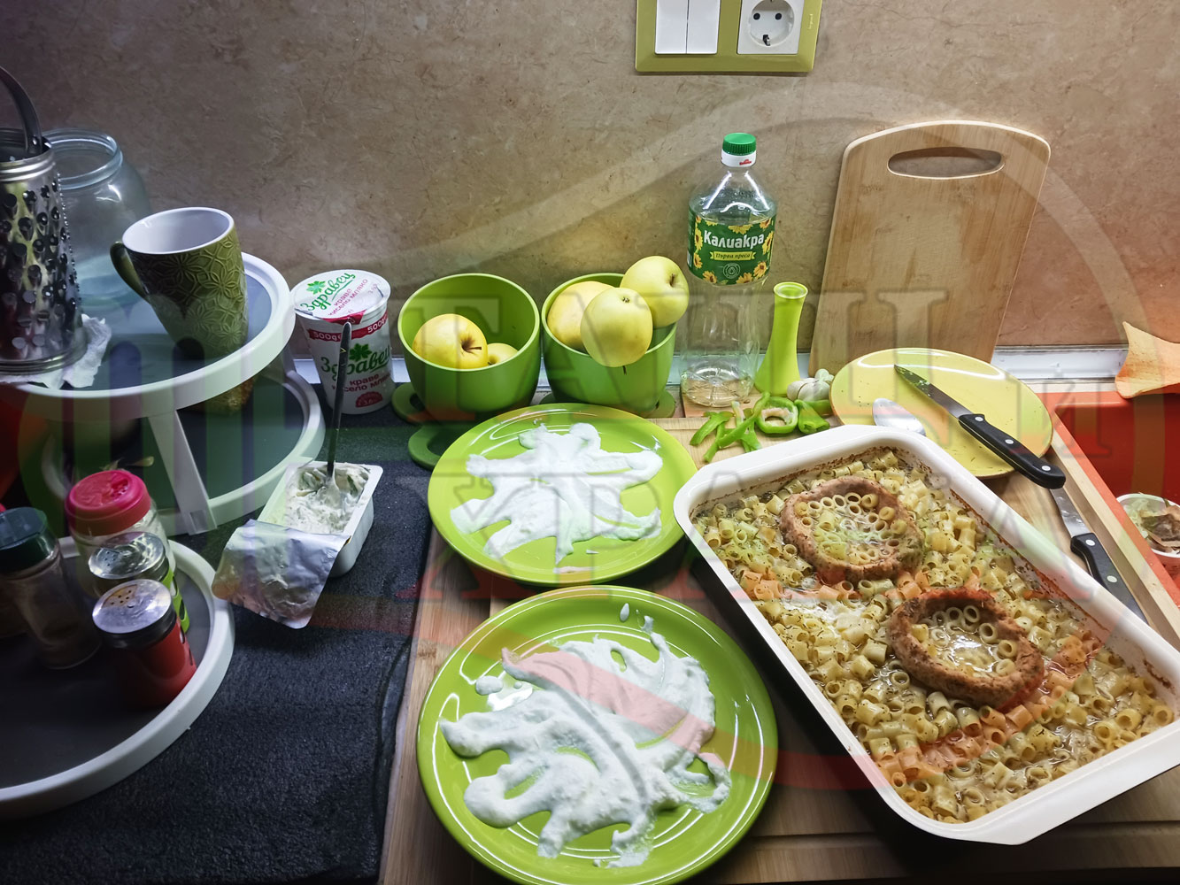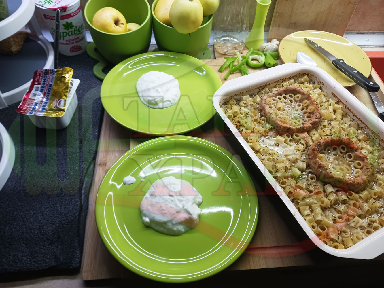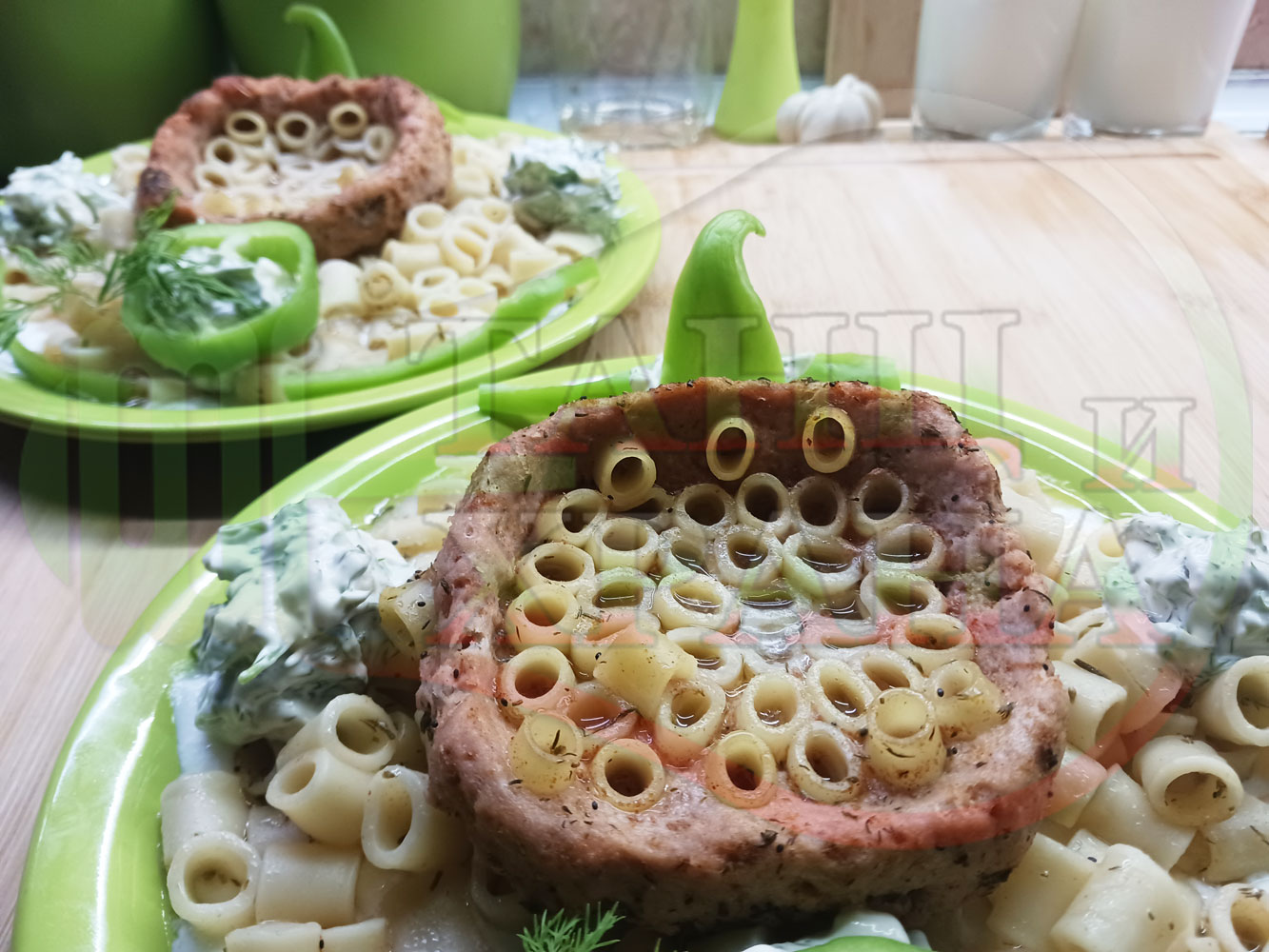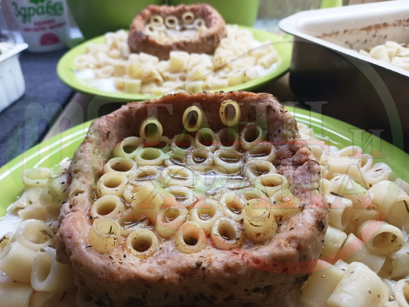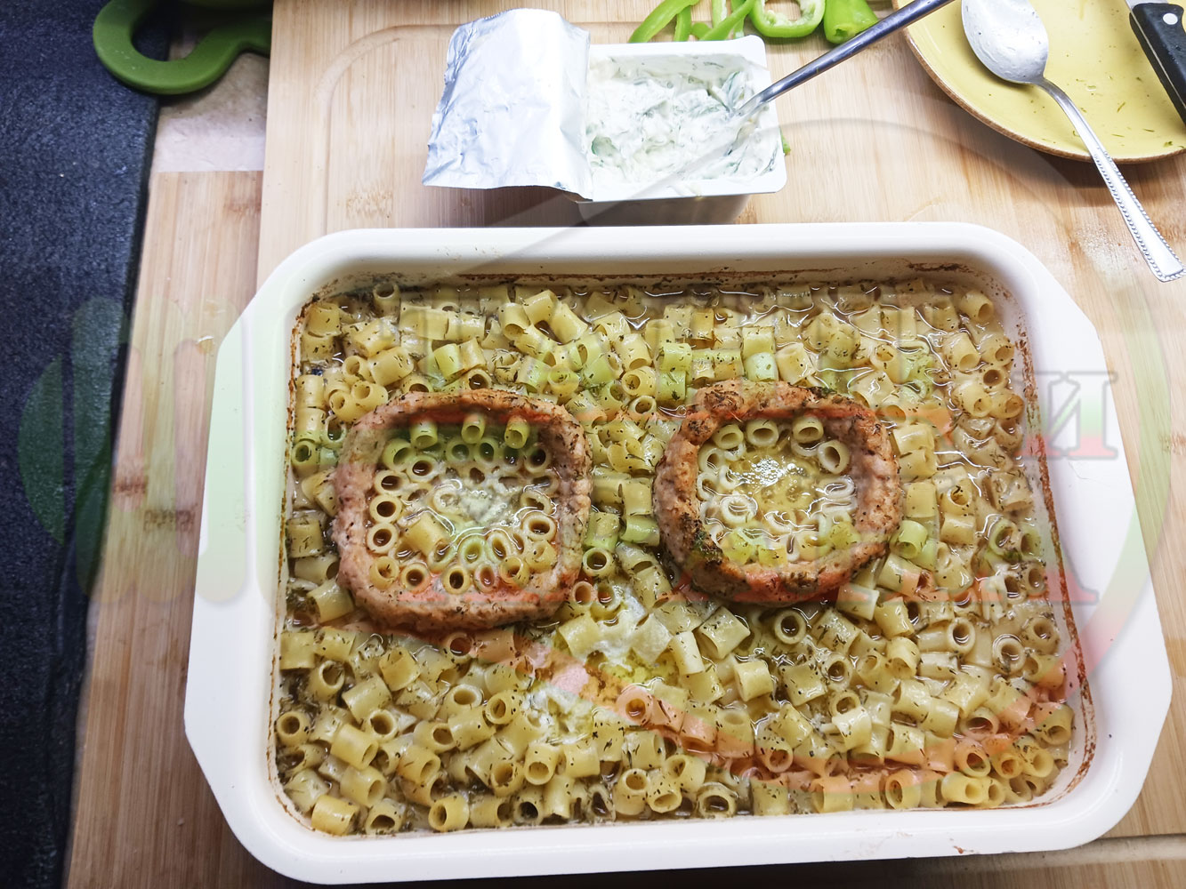Български къси макарони "Каймянопрободни майонезенокопърови киселомлечни" сварени на фурна с квадратни кюфтета от кайма, ронена чубрица и червен сладък пипер гарнирани с крем от майонеза, копър и чесън и кисело мляко от България - двукомпонентни