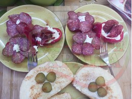 Подредете по 5 елипсовидни кръгчета от нарязания манастирски суджук върху сиреновия крем във всеки чушков обръч. Украсете порциите с чушковите връхчета (украсете по ваше желание и усмотрение).