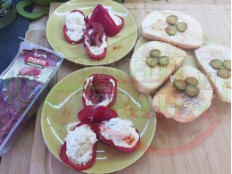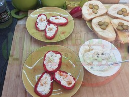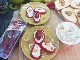 Българска майонезена сурова салата "Суджуковоманастирска киселокраставична червеночушкова с БГсирене" приготвена със сиренов крем с краве бяло сирене, майонеза, чесън и кисели краставички напълнена в червени пресни чушки гарнирана със суджук - двуком