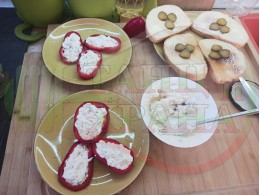 ПРОДУКТИ: Приблизителни количества за българска майонезена сурова салата "Суджуковоманастирска киселокраставична червеночушкова с БГсирене" приготвена със сиренов крем с краве бяло сирене, майонеза, чесън и кисели краставички напълнена в червени пресни чушки гарнирана със суджук - двукомпонентна