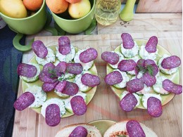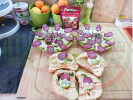 Българска сурова салата "Тиквичковолуканкова майонезена с БГсирене" приготвена със сиренов тиквичково майонезен крем с майонеза, стар чесън, копър и краве бяло сирене (българско, саламурено) гарнирана с тиквички и луканка - двукомпонентна