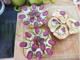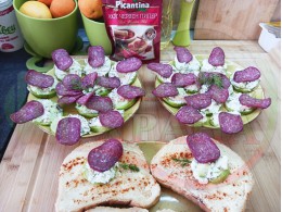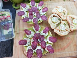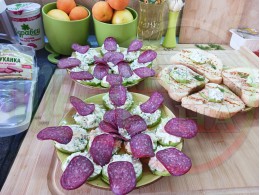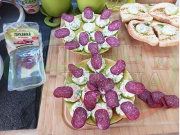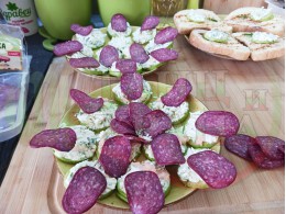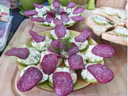 Спретнах вкусна и витаминозна българска зеленчукова салата, приготвена със сиренов тиквичково майонезен крем от българско краве бяло саламурено сирене, пресни тиквички, свеж копър, стар чесън и майонеза. Имах останал трълян боб с моркови около 4 супени лъжици и реших да го "тагна" към салатата като вид бобена основа. Нарязах пресните тиквички на кръгчета, намазах ги със сиреновия тиквичково майонезен крем и гарнирах с нарязаната на елипсовидни кръгчета луканка. Получи се изключително вкусна, полезна и витаминозна салата, вплела българския дух и енергия в обичани от всеки българин традиционни продукти като българското краве бяло, саламурено сирене и луканката.