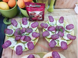 Измийте тиквичката, нарежете я на кръгчета и подредете кръгчетата по диаметъра на чиниите (заделете част от по-малките кръгчета за украса на филийките). Разпределете равномерно сиреновия крем върху всяко тиквичково кръгче и го размажте и загладете. Поставете по 1 елипсовидно, нарязано кръгче от луканката върху всяко намазано с крем кръгче от тиквичката. Навийте част от кръгчетата на луканката и ги поставете в центъра на чиниите между част от тиквичковите кръгчета. Украсете порциите със стръкчета свеж копър (подредете и украсете салатата по ваше желание и усмотрение).