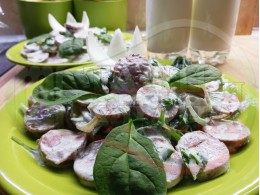 Гювечета "Пряснозелеви с наденица" запечени на фурна с родопска наденица, прясно зеле, домати, кромид лук, чесън, лютеница и яйца гарнирани с големи топки от сиреново зелев крем с краве бяло сирене и свеж копър - двукомпонентни