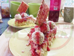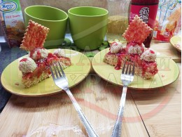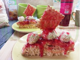 Бисквитена плодова млечна мини торта "Малиновосиропена прясномлечна топчестосусамова" приготвена с обикновени бисквити с масло, малинов сироп и прясно мляко гарнирана с бисквитени трюфели със суров сусам
