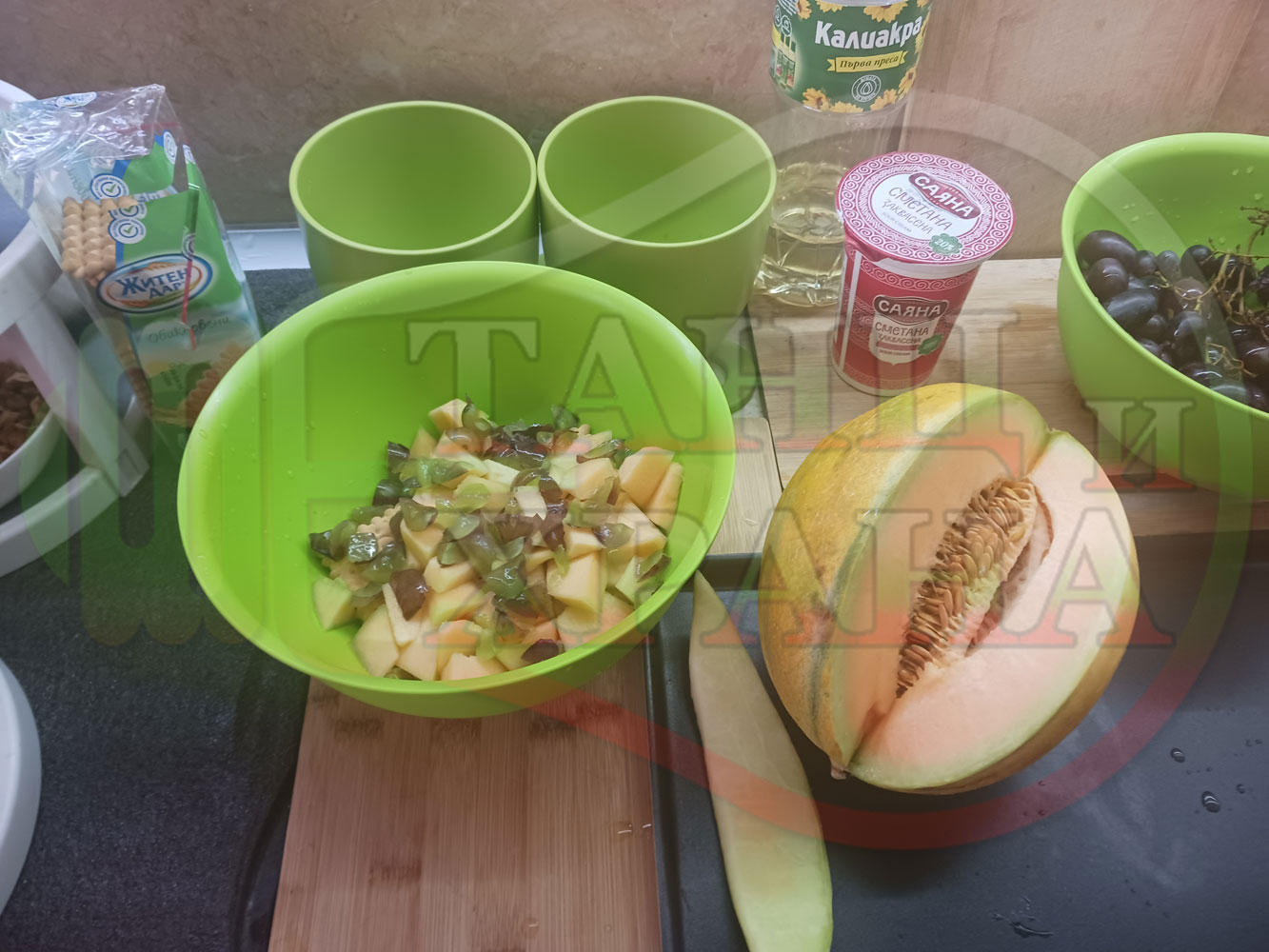 Надробете бисквитите в купа и добавете измития и нарязан на малки парченца пъпеш. Измийте гроздето и го нарежете на дребно. Извадете семките при нарязването на гроздовите зърна. Сипете нарязаното грозде в купата. Разбъркайте и намачкайте с вилица до образуване на сравнително гъста хомогенна, бисквитено плодова смес. Ако сместта е прекалено рядка (заради различното водно съдържание на гроздето и пъпеша), добавете бисквити за сгъстяване. Ако сместта е прекалено гъста, разредете с грозде или пъпеш. След всяко добяване на съответния продукт за сгъстяване или разреждане е желателно да ръзбърквате и намачквате с вилица за да прецените гъстотата.