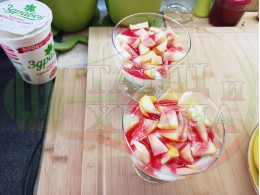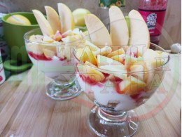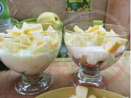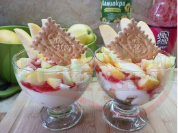 Бисквитен плодов млечен десерт "Ябълков малиновосиропен киселомлечен" приготвен с обикновени бисквити, кисело мляко от България и пресни, жълти ябълки гарниран с малинов сироп