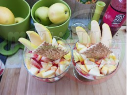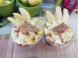 Начупете по 10 бисквити на малки парченца в стъклени чаши и сипете по 250 грама българско кисело мляко върху бисквитите. Измийте, почистете ябълката от семките и твърдата вътрешна част и я нарежете на малки парченца (нарежете част от ябълката на резени за украса). Разпределете нарязаните парченца ябълка върху киселото мляко във всяка чаша (или оформете произволни фигури с парченцата ябълка).