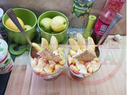 Спретнах изключително вкусен и полезен бисквитен, млечен десерт, приготвен с пресни ябълки, българско кисело мляко от България и с най-вълшебния малинов сироп от най-обичания плод. Бисквитите усвояват млечната, едва доловима киселина на млякото и запазват хрупкавостта си, в идеална хармония със сока от пресните ябълки. Малиновият сироп балансира, допълва и обогатява вкусовете с нежната сладост на вълшебните малини... Отново спретнах голяма вкусно, вкусна, вкусотия (вкуснотия). ![]()