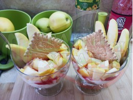 Сипете по 2,5 супени лъжици от малиновия сироп върху ябълките и украсете всяка порция с ябълковите резени и с по 1 цяла, обикновена бисквита (украсете по ваше желание и усмотрение).