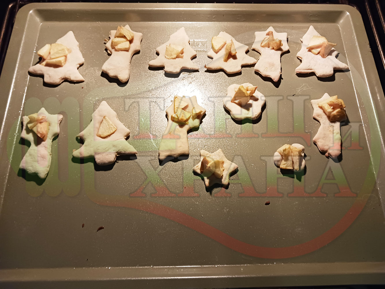Поръсете с брашно работната площ върху, която ще разточвате. Извадете купата от хладилника и поставете тестото върху поръсената с брашно работна площ (използвайте силиконова подложка за разточване, в случай че имате такава). Разточете тестото до средно дебела кора около 2 см. и оформете различни видове фигурки с метални формички или с малки чашки и други видове кухненски прибори. Съберете отразъците от тестото, които са останали след оформянето на фигурките, размесете го, набрашнете работната площ и отново го разточете и отрежете различни коледни фигурки. Повторете процедурата до пълното оползотворяване на тестото или заделете част от него за последващо изпичане на курабийки или за друг вид коледно печиво. На част от курабийките оформете малки вдлъбнатини с капачка или друг вид подходящ прибор, поставете част от нарязаната на парченца ябълка във всяка вдлъбнатина и поръсете ябълковите парченца с кристална захар.