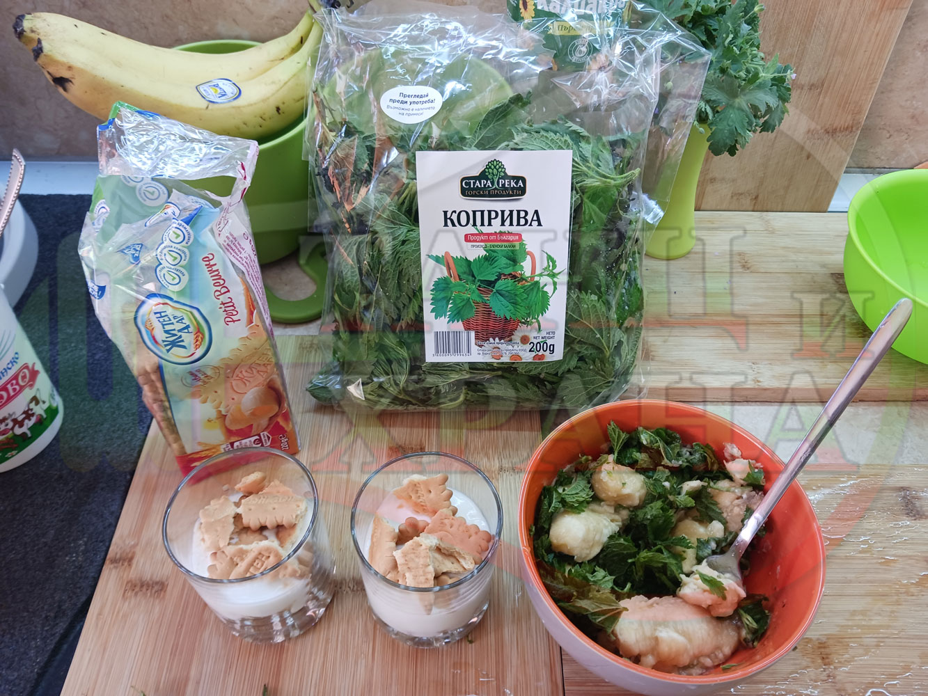 Бисквитен млечен десерт "Бисквитен копривнобананов" приготвен с обикновени бисквити и кисело мляко от България с копривен бананов крем от банани и свежа коприва