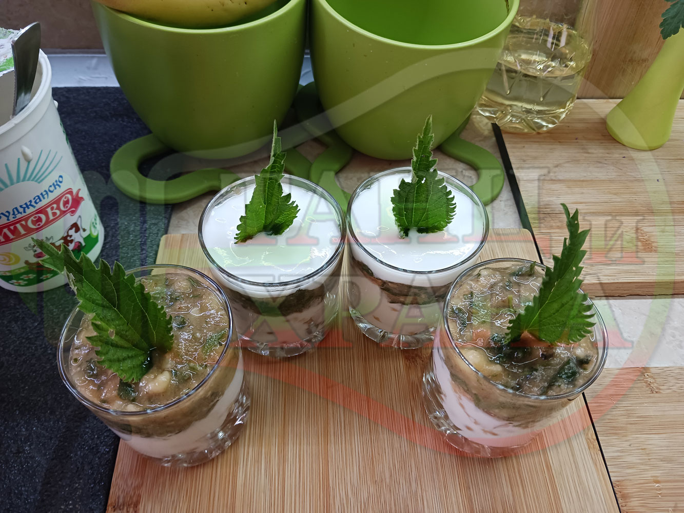 Начупете по 2 бисквити в 4 стъклени чаши или друг вид десертни съдове и сипете по 2 супени лъжици кисело мляко. Начупете по една бисквита върху киселото мляко и добавете по 2 супени лъжици от копривния бананов крем. Добавете по 1 супена лъжица кисело мляко  върху копривно банановия крем в 2 от чашите (в случай, че количеството на крема е по-малко). Украсете порциите със стръкчета от копривата или само с листенца.