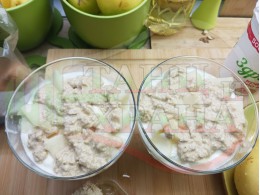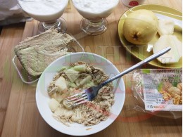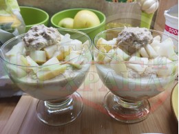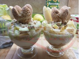 Български курабиен плодов млечен десерт "Крушов халвяноорехов киселомлечен" приготвен с готови курабии, кисело мляко от България и халвян крем с пресни круши и биологична орехова тахан халва
