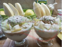 В  "Свързани продукти" вижте рецептите на други видове млечни, плодови и зеленчукови десерти с българско кисело мляко и пресни круши, салати, сурови млечни супи с плодове и техни"ТЕ" производни.