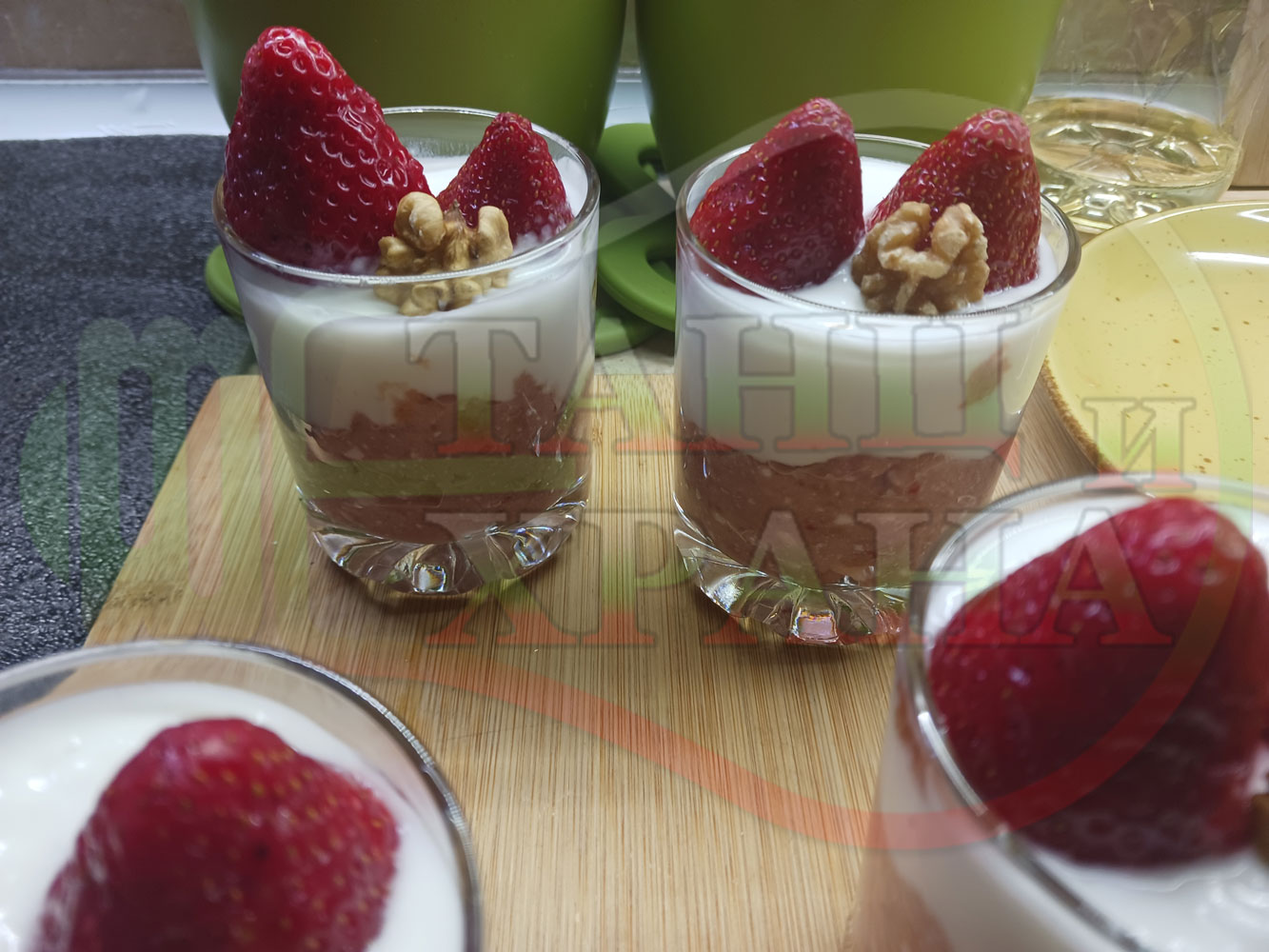 Хлебен млечен десерт "Ягоднан с БГсирене" приготвен с банани, пресни ягоди, краве бяло сирене и кисело мляко от България гарниран със сурови орехи