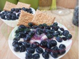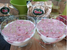 Ягодов млечен десерт "Ягодовоядков лютивопиперков киселомлечен" приготвен с пресни ягоди, печено кашу и червен лютив пипер сурово реден с кисело мляко от България гарниран със шам фъстък
