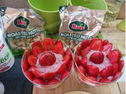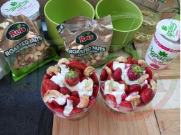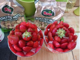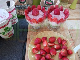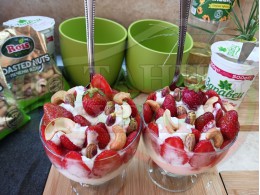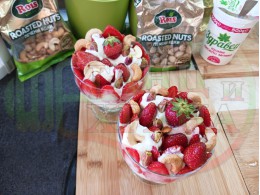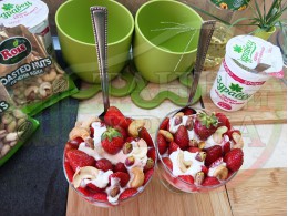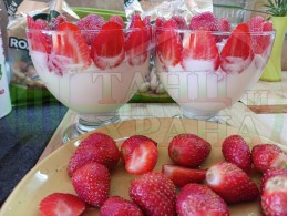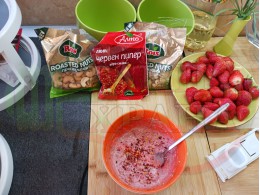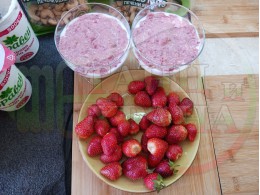 ПРОДУКТИ: Приблизителни количества за ягодов млечен десерт "Ягодовоядков лютивопиперков киселомлечен" приготвен с пресни ягоди, печено кашу и червен лютив едросмлян пипер сурово реден с кисело мляко от България гарниран със шам фъстък