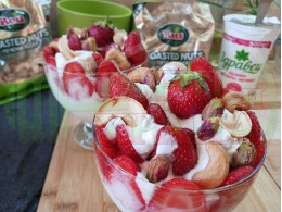 Ягодов млечен плодов десерт, приготвен с пресни ягоди и ягодов крем с печено осолено кашу и червен лют пипер. Реших да съчетая сладката с леко осолената и премерено лютивата нотки от запечени ядки и едросмлян лютив пипер. Киселото мляко от България обединява вкусовете и ги допълва с лек, възкисел и освежаващ нюанс а шам фъстъците и кашуто внасят хрупкав елемент. Получи се голяма вкусно, вкусна, вкусотия...(вкуснотия)... леко лютива "бомбастична"...![]()