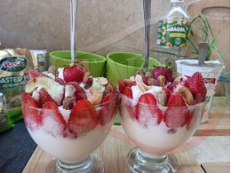 Добавете мед между киселото мляко и ягодовия крем и/или залейте нарязаните ягоди, с които сте гарнирали десертите с мед на вкус (в случай, че ягодите не са много сладки, препоръчвам да добавите мед според вашия вкус или друг вид подсладител като пудра захар, кристална захар и т.н.).
