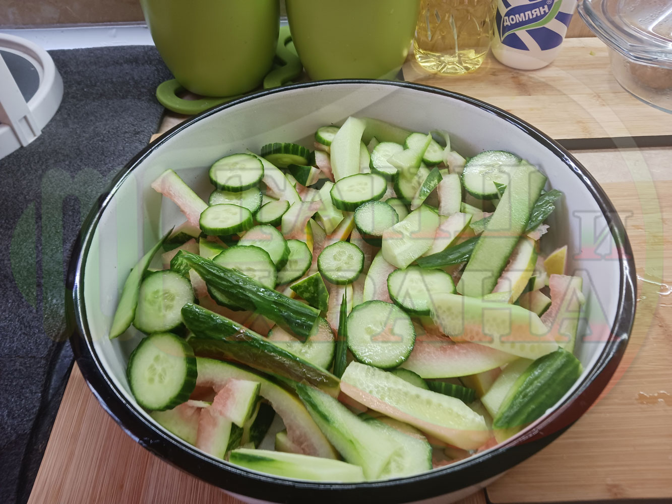 Как да не сваря сладко от кори след като имам динени кори от изядената вкусна студена българска сладко солена супа.laughing Сладкото от кори на диня се получи доста вкусно с лека, едва доловима карамелизация. Сладкото го сварих с пресни краставици и сурови орехи.