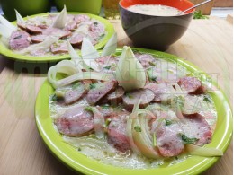 Спретнах млечна яхния със сварена и запечена на фурна родопска наденица с кромид лук и бял сос. Белият сос се получи с копринена мекота и свежестта на магданоза дообогатиха вкуса в идеална хармония и баланс с прясното мляко, кравето масло, чесъна и брашното. Отново се получи неимоверна вкусно, вкусна, вкусотия (вкуснотия).