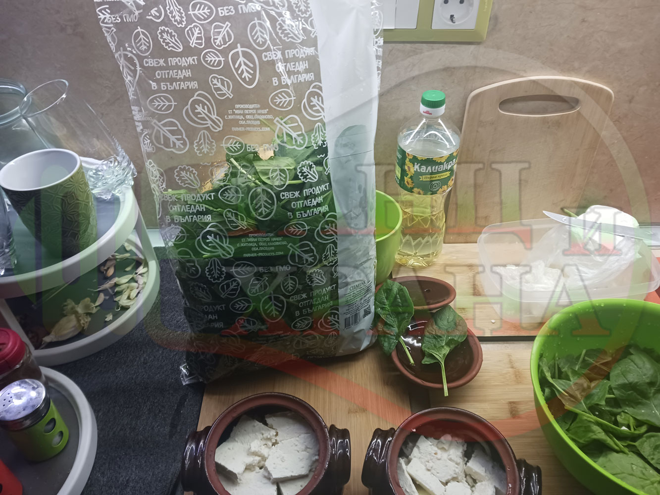ПРОДУКТИ: Приблизителни количества за гювечета "Сиренак" запечени на фурна с краве бяло сирене, свеж спанак, зелени пресни чушки, моркови, кромид лук, домати и яйца гарнирани с листенца спанак