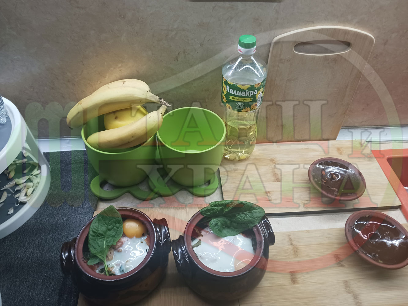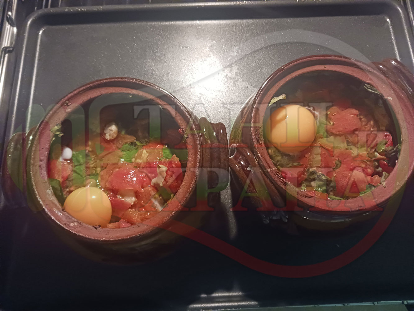 Извадете гювечетата след 50-та минута. Добавете по 1 яйце във всяко гювече и дозапечете на фурна без вентилатор на 180 градуса за около 10 минути.