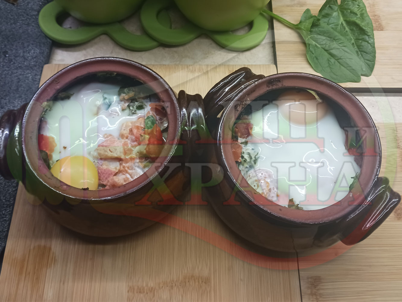 Гювечета "Сиренак" запечени на фурна с краве бяло сирене, свеж спанак, зелени пресни чушки, моркови, кромид лук, домати и яйца гарнирани с листенца спанак