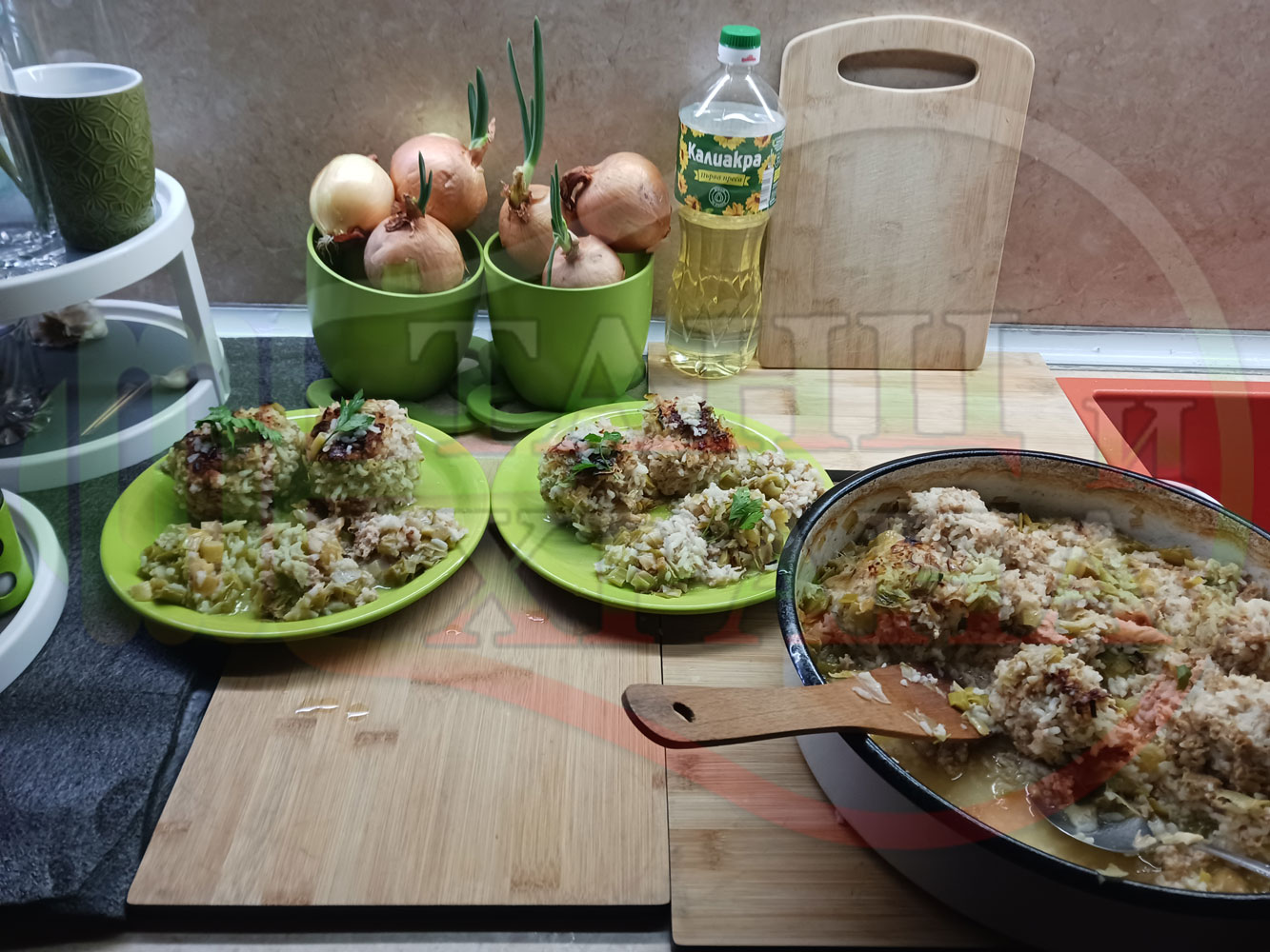 Лучена яхния "Кюфтета с ориз " приготвена на фурна с праз лук, слънчогледово олио и краве масло с оризови кюфтета от мляно месо (свинско с телешко) и ориз