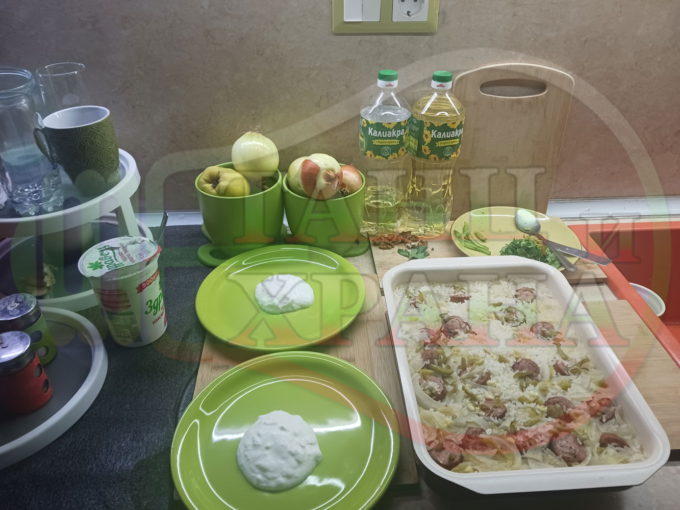 Вкусен ориз, сварен и запечен на фурна с родопска наденица шпикована със зелени пресни чушки. Аромат на запечени чушки и едва доловима карамелизация и сладост на лука. Киселото мляко от България е един от почти задължителните продукти, когато хапваме някакво ястие с ориз или зеленолистни като спанак и лапад. Оризът обича млякото и вкусът на ястието се балансира.