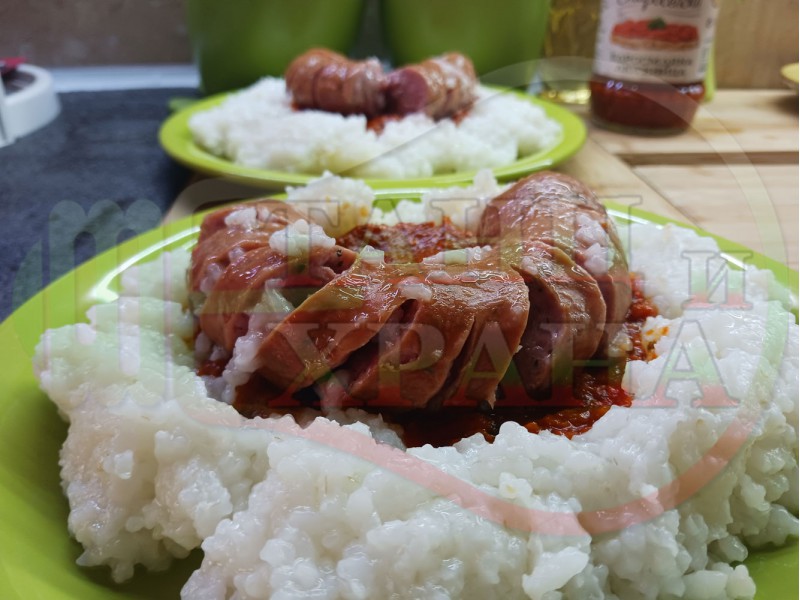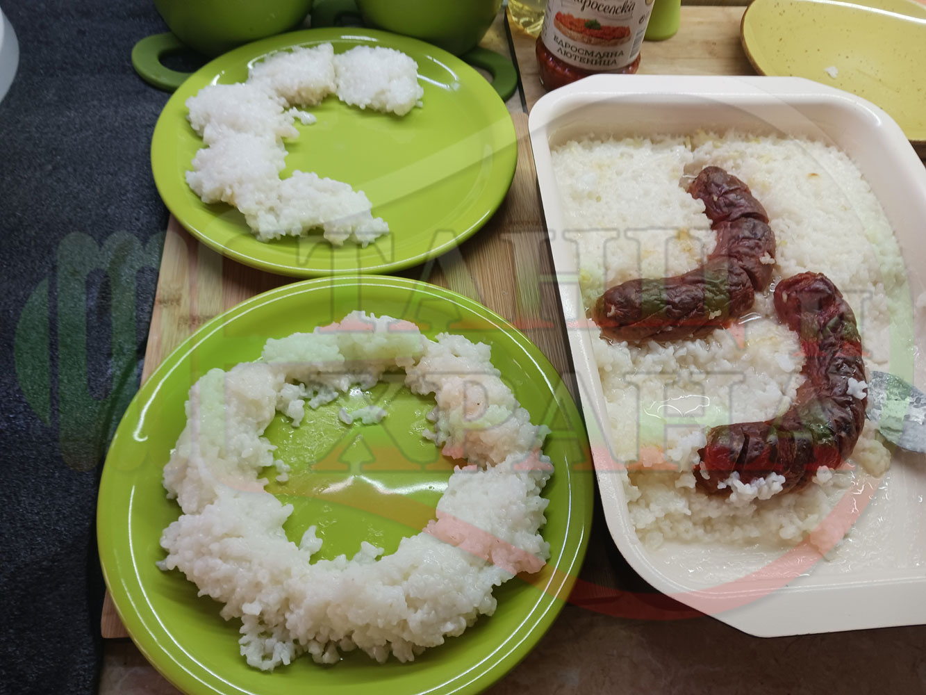 ВНИМАНИЕ: Фурните са различни и съответно времето за сваряване и запичане е ориентировъчно. Наблюдавайте процеса на запичане и при необходимост, покрийте с капак или отстранете тавата от фурната. Обърнете поне 1 път наденицата за да се запече от 2-те страни (имайте предвид, че едната страна на наденицата остава по-светла (страната, която е в ориза)).