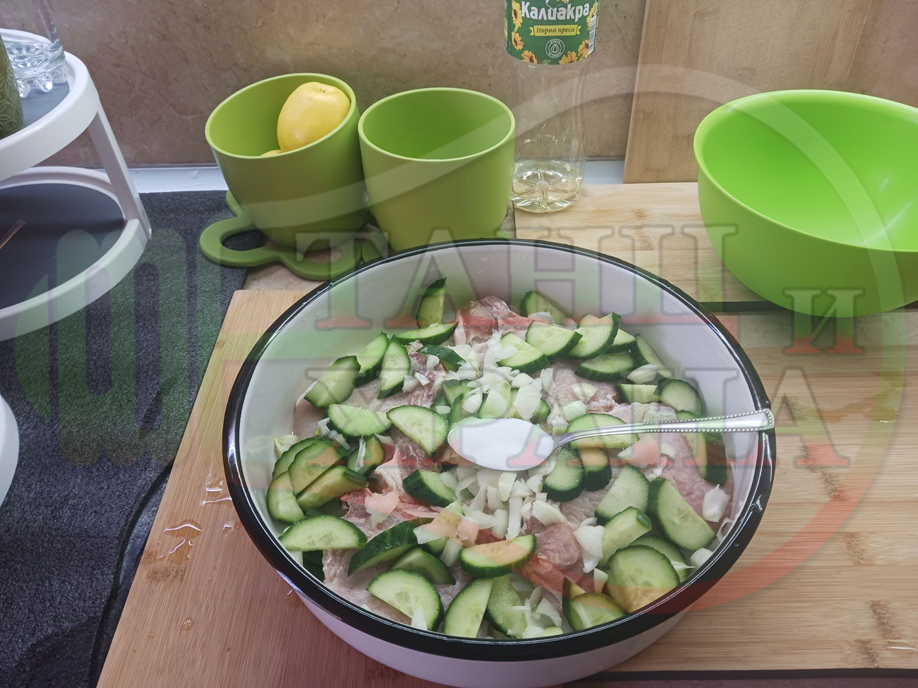 Измийте пържолите и ги поставете в тава за печене. Измийте краставицата, нарежете я на едро (без да я белите) и я добавете в тавата. Обелете, измийте и нарежете лука на едро. Добавете нарязания лук, солта и слънчогледовото олио в тавата. Налейте топла към гореща вода от чешмата и разбъркайте. Поставете тавата в предварително загрятата фурна. Сварете и леко запечете на фурна без вентилатор на 180 градуса за около 70 минути.