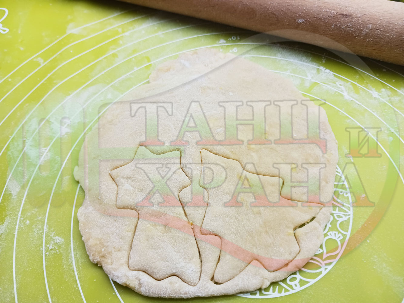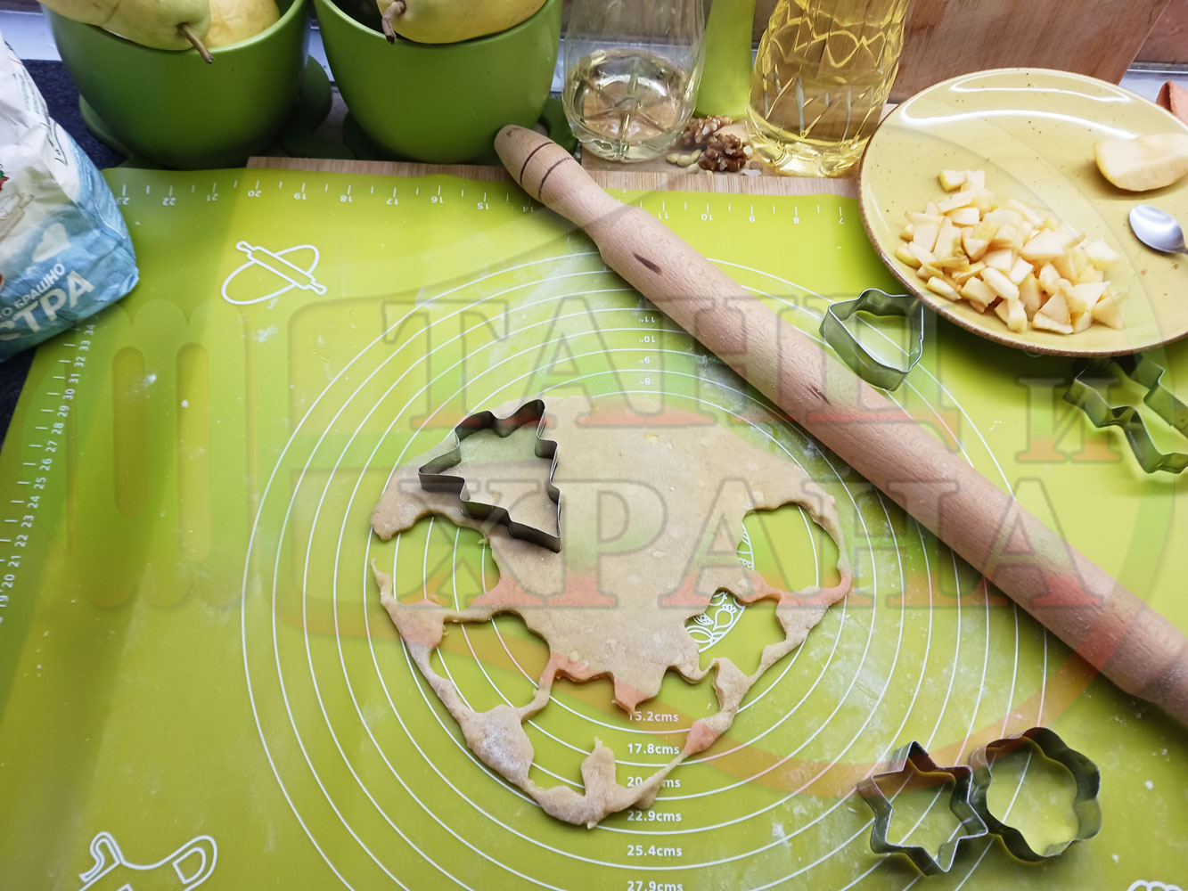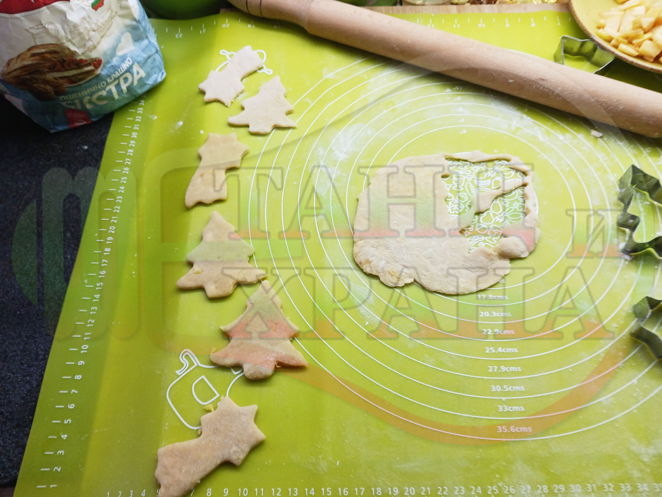 Поръсете с брашно работната площ върху, която ще разточвате. Извадете купата от хладилника и поставете тестото върху поръсената с брашно работна площ (използвайте силиконова подложка за разточване, в случай че имате такава). Разточете тестото до средно дебела кора около 2 см. и оформете различни видове фигурки с метални формички или с малки чашки и други видове кухненски прибори. Съберете отразъците от тестото, които са останали след оформянето на фигурките, размесете го, набрашнете работната площ и отново го разточете и отрежете различни коледни фигурки. Повторете процедурата до пълното оползотворяване на тестото или заделете част от него за последващо изпичане на курабийки или за друг вид коледно печиво. На част от курабийките оформете малки вдлъбнатини с капачка или друг вид подходящ прибор, поставете част от нарязаната на парченца ябълка във всяка вдлъбнатина и поръсете ябълковите парченца с кристална захар.