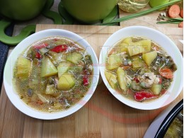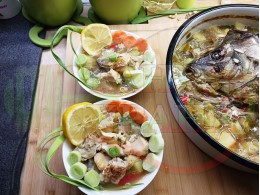 Никулденска рибена супа "Шарановоглава червеночушковоморковена празлученокартофена 2025 г." сварена и запечена на фурна с праз лук, картофи, червени пресни чушки и моркови